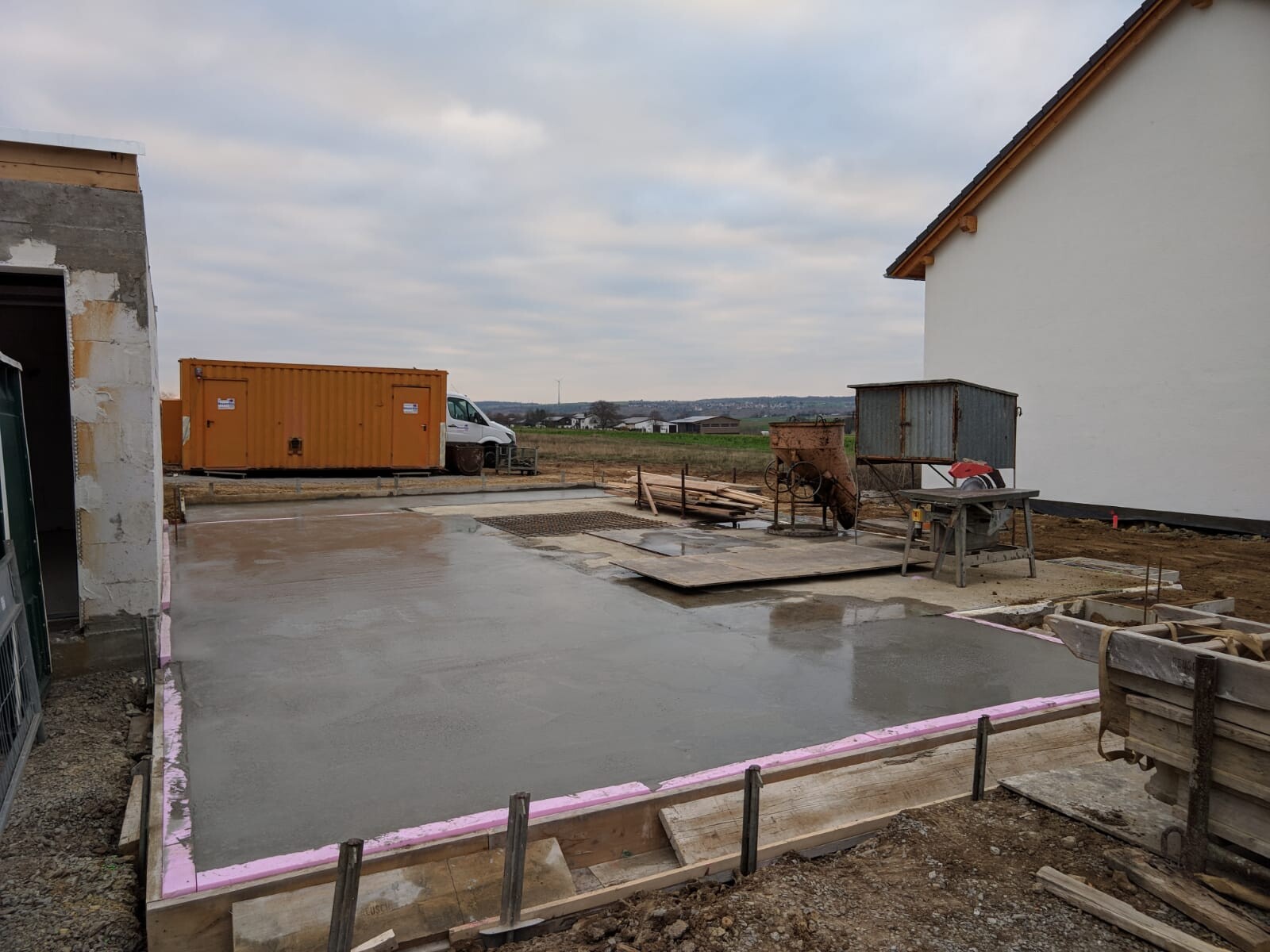 Baustelle: frisch gegossene Fundamentplatte, Holzformen, orange Container und Bauwagen.
