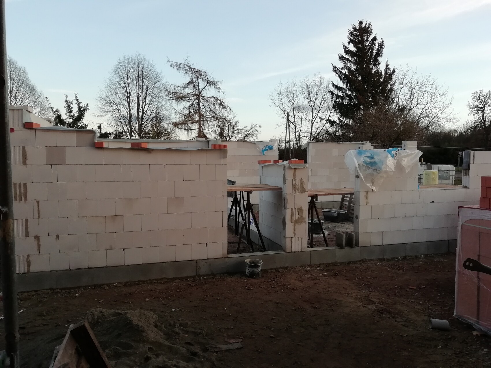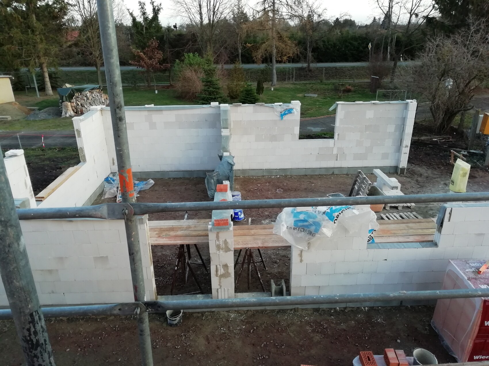 Baustelle: Wand aus weißen Porenbetonblöcken; Gerüststangen und Baumaterialien im Vordergrund.