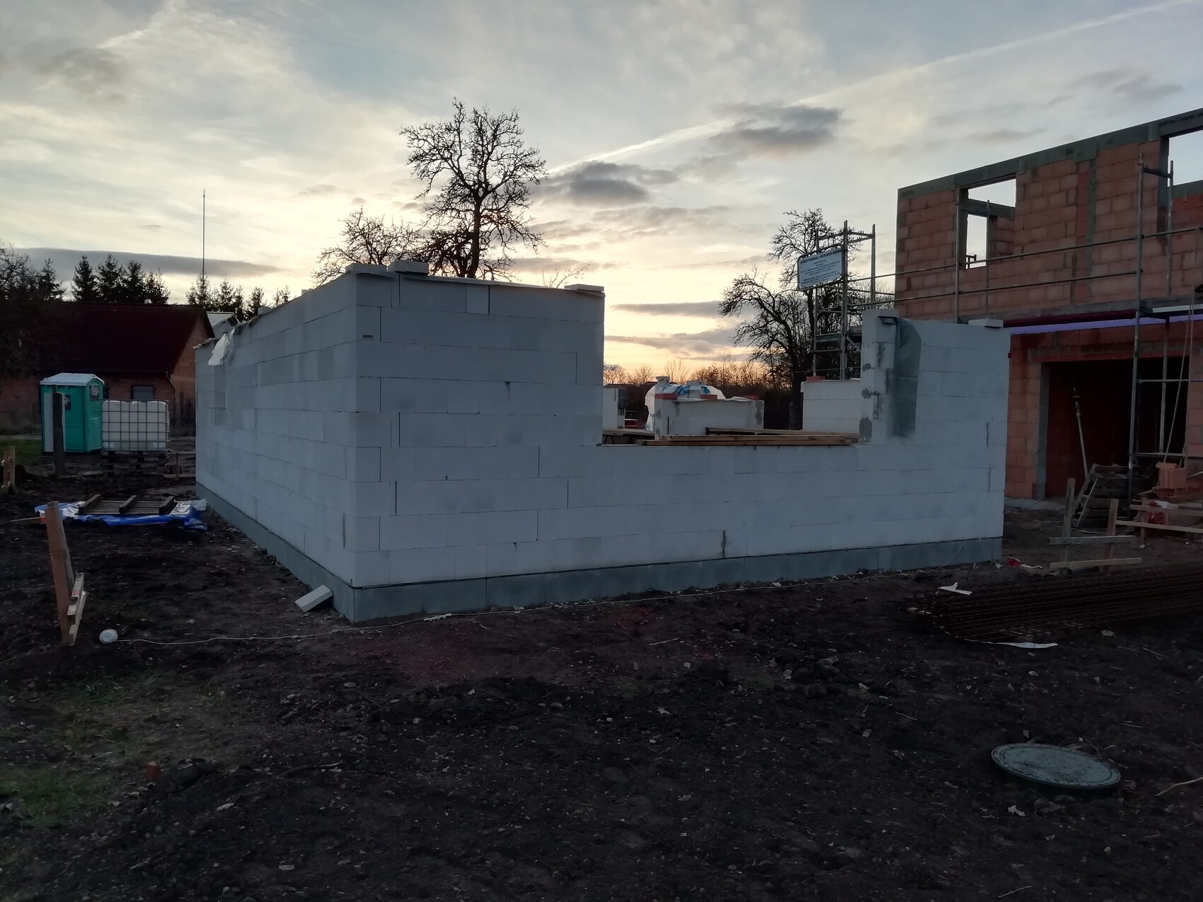 Baustelle: hellgraue Blockwand mit Öffnung, rechts Rohbau mit Gerüst und Abendhimmel.