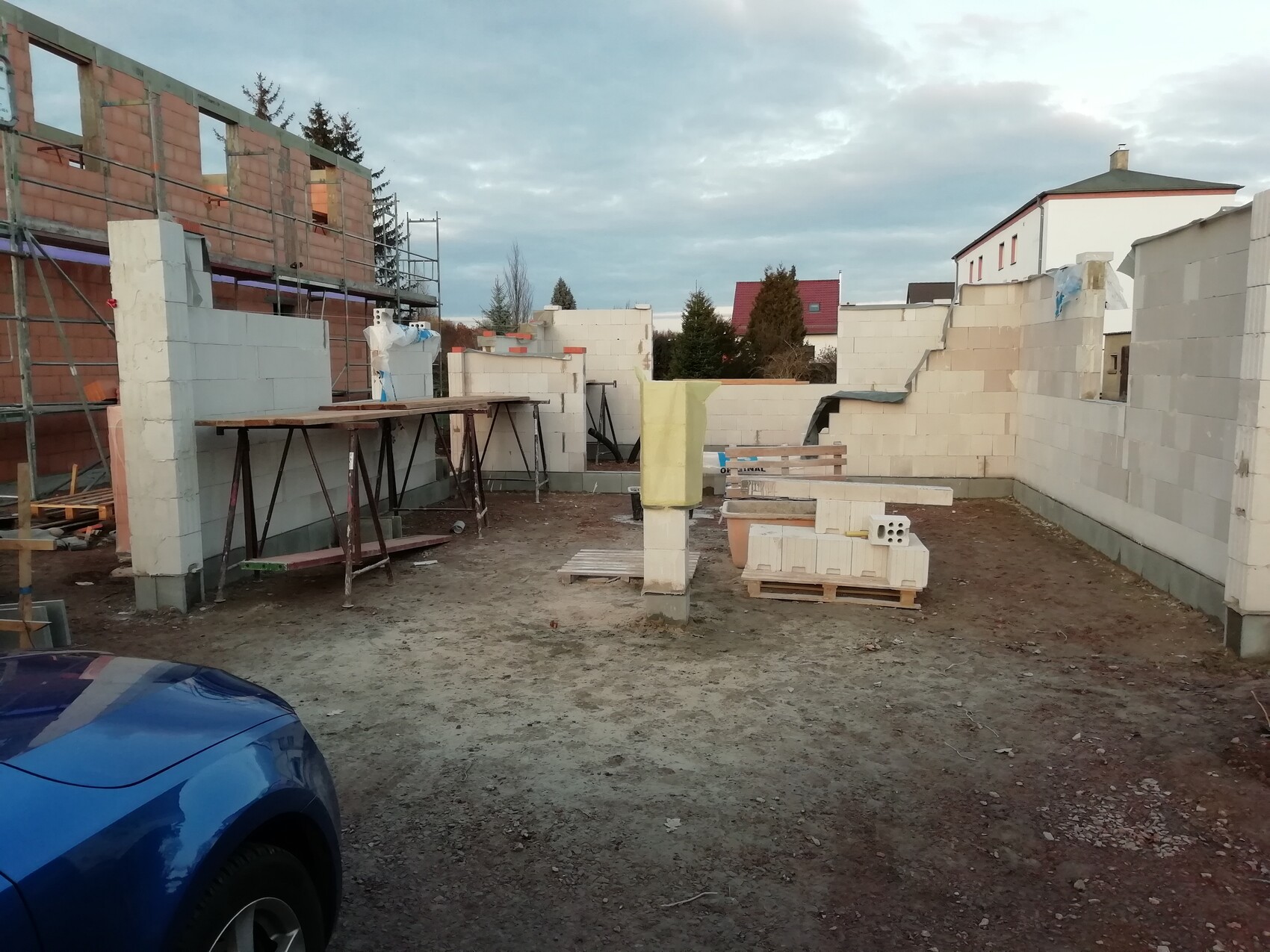 Baustelle mit unfertigen weißen Betonblöcken, Gerüst links, Paletten; blaues Auto vorn.