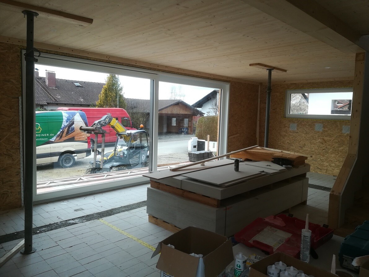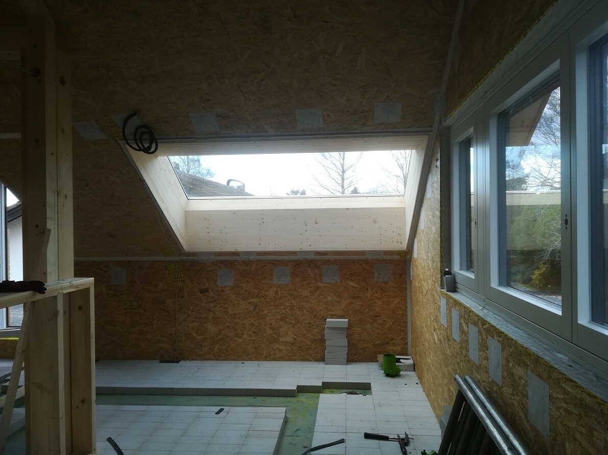 Daher hab ich leider noch kein Foto von der Maschine, die da die großen Fenster in die Rahmen gehoben hat. Ich krieg aber sicher noch welche. Ich hab einen Film gesehen, den mein Göttergatte davon gemacht hat, das ist schon beeindruckend! Die große Scheibe im OG wiegt immerhin über 500kg.