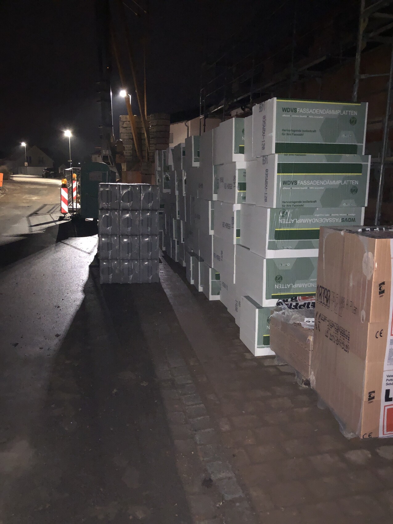 Nächtliche Baustelle mit gestapelten WDVS-Fassadendämmplatten neben einer Straße.