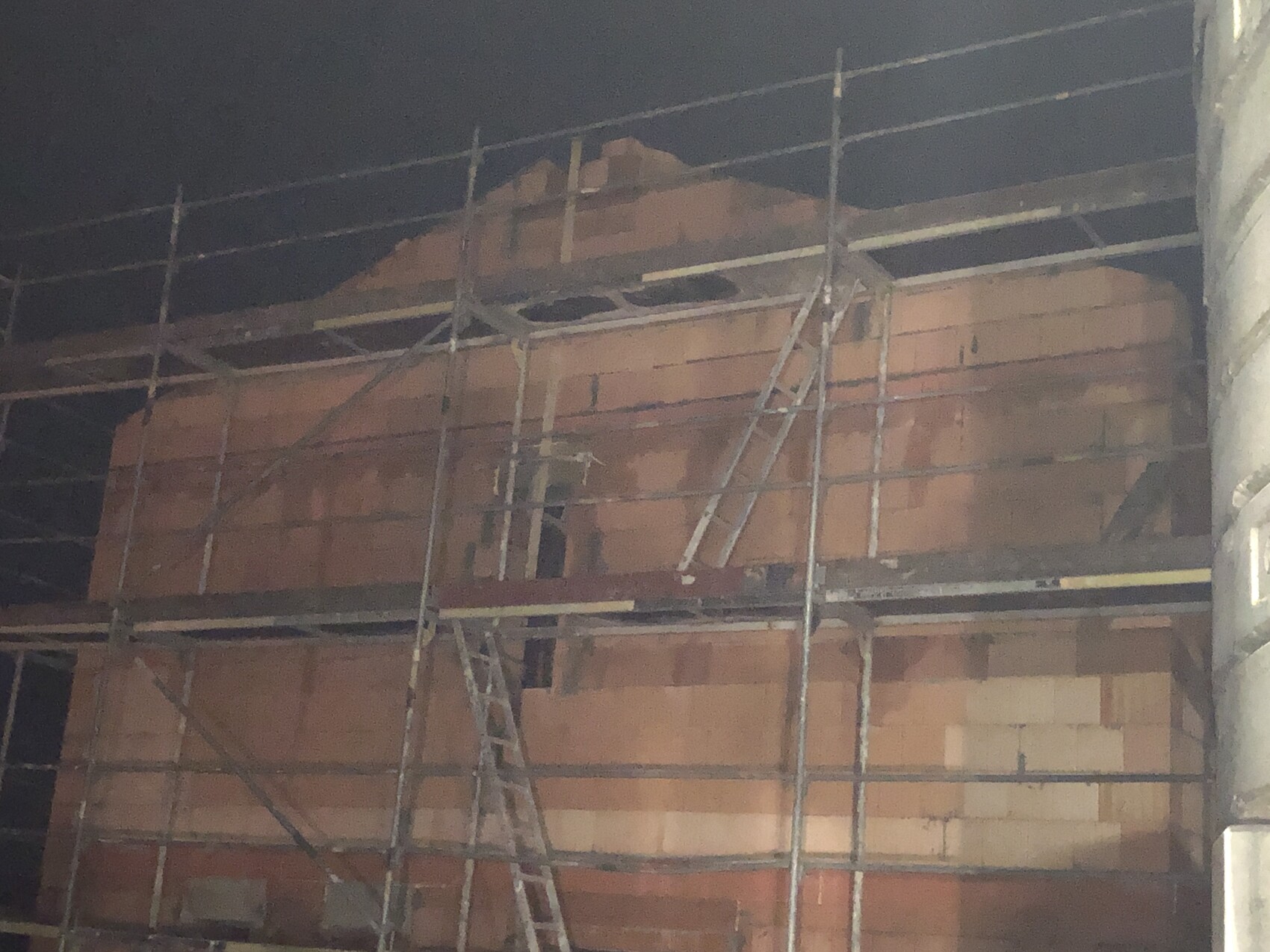 Baugerüst vor roter Ziegelwand auf dunkler Baustelle, Leitern und Stahlrohre sichtbar.