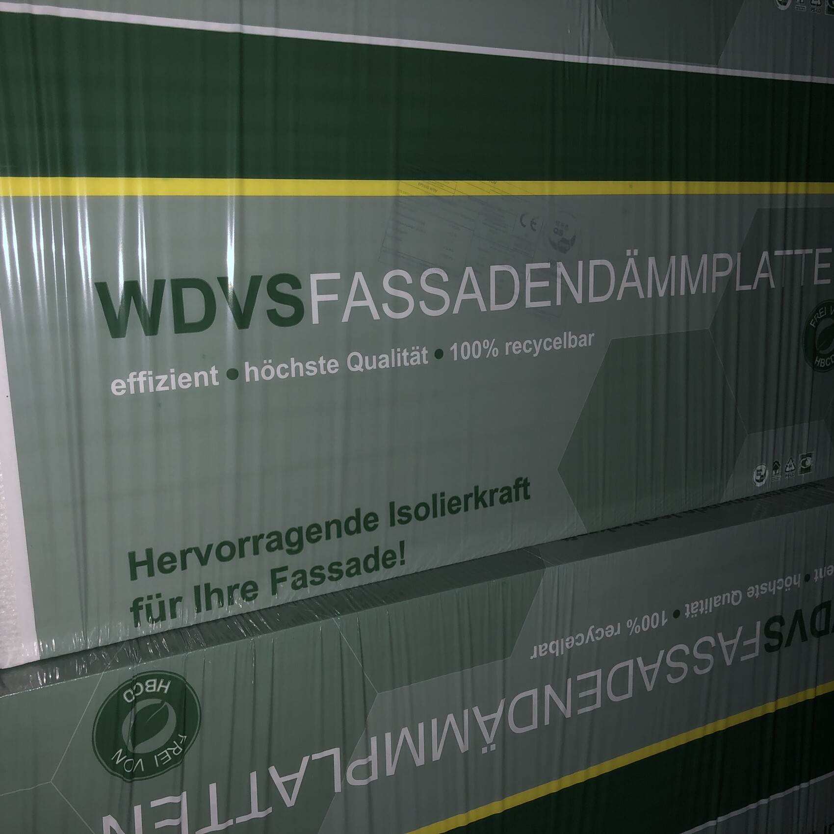 Grüne Verpackung von WDVS-Fassadendämmplatten mit Hinweis auf Effizienz und Recycling.