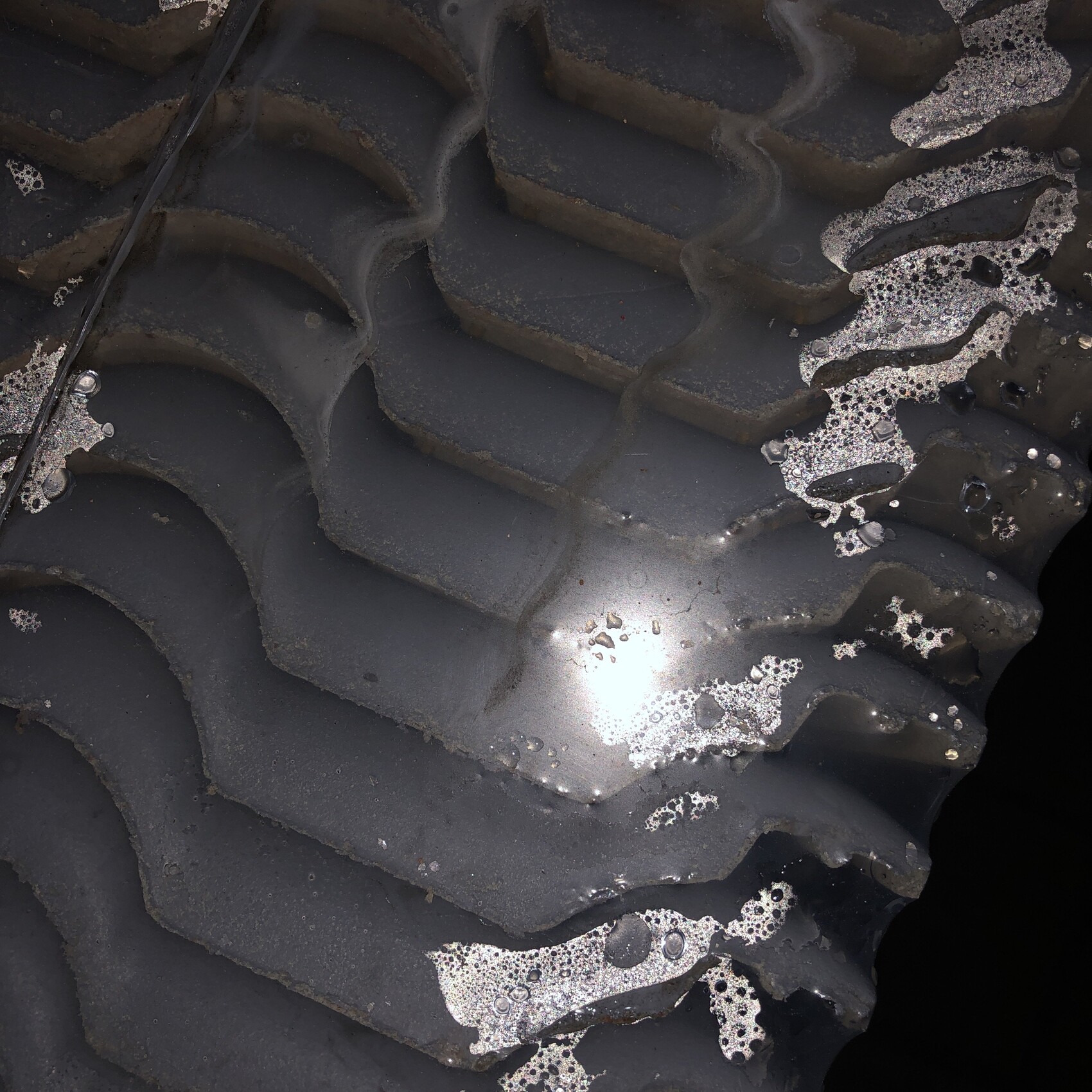 Nahaufnahme einer dunklen, schichtigen Gesteinsoberfläche mit welligen Rillen und silbernen Flecken.