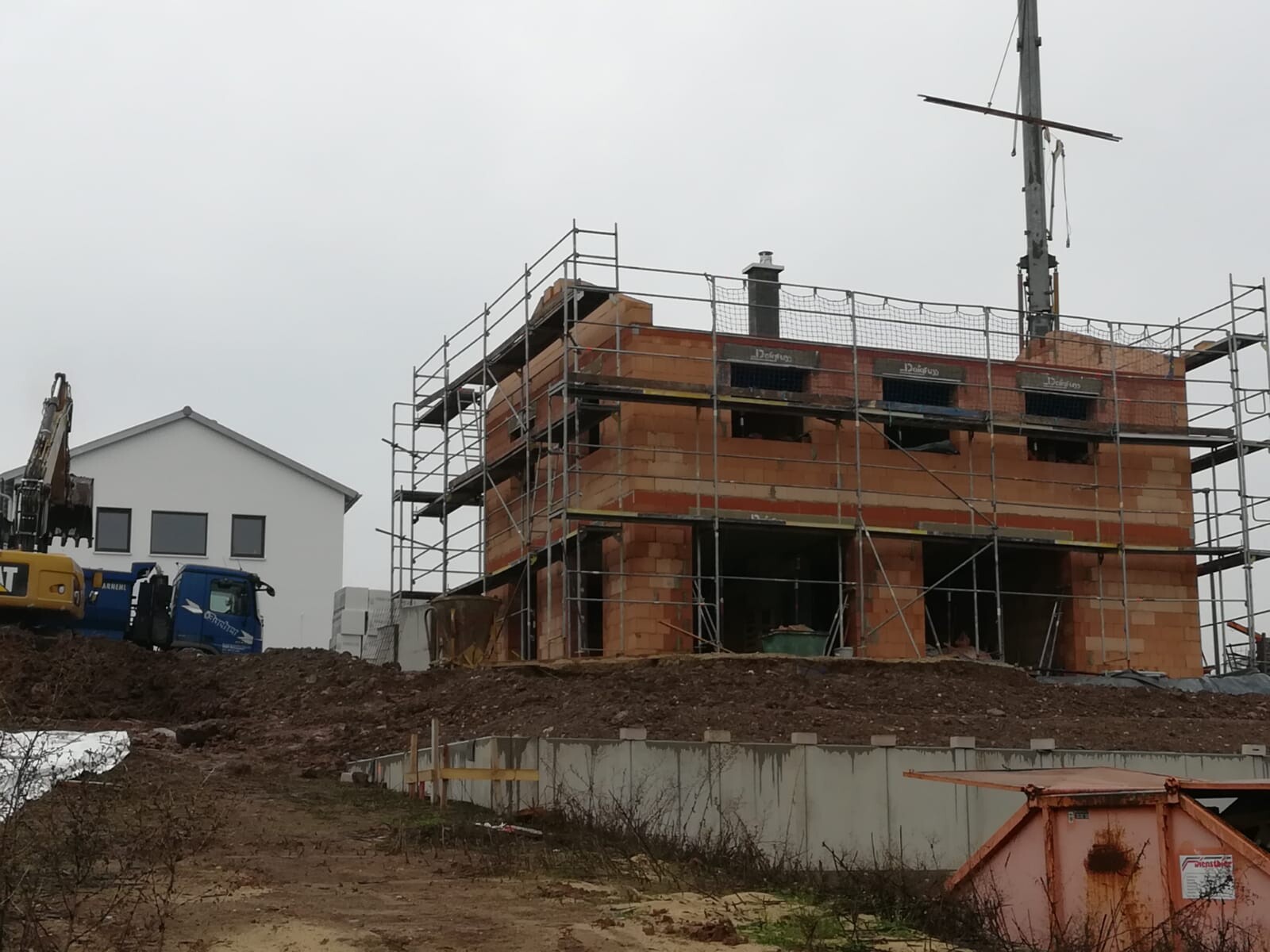Baustelle mit rotem Backsteinhaus im Rohbau, Gerüst und Kran, Baumaschinen links.