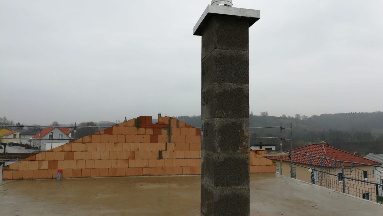 Dachbaustelle: dunkle Stein-Säule mit Metallkappe im Vordergrund, orange Ziegelmauer und Gerüst.