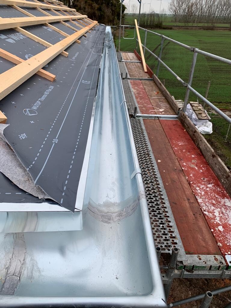 Der Dachdecker hat heute parallel weiter gemacht und mit der Dachrinne am Haus angefangen.