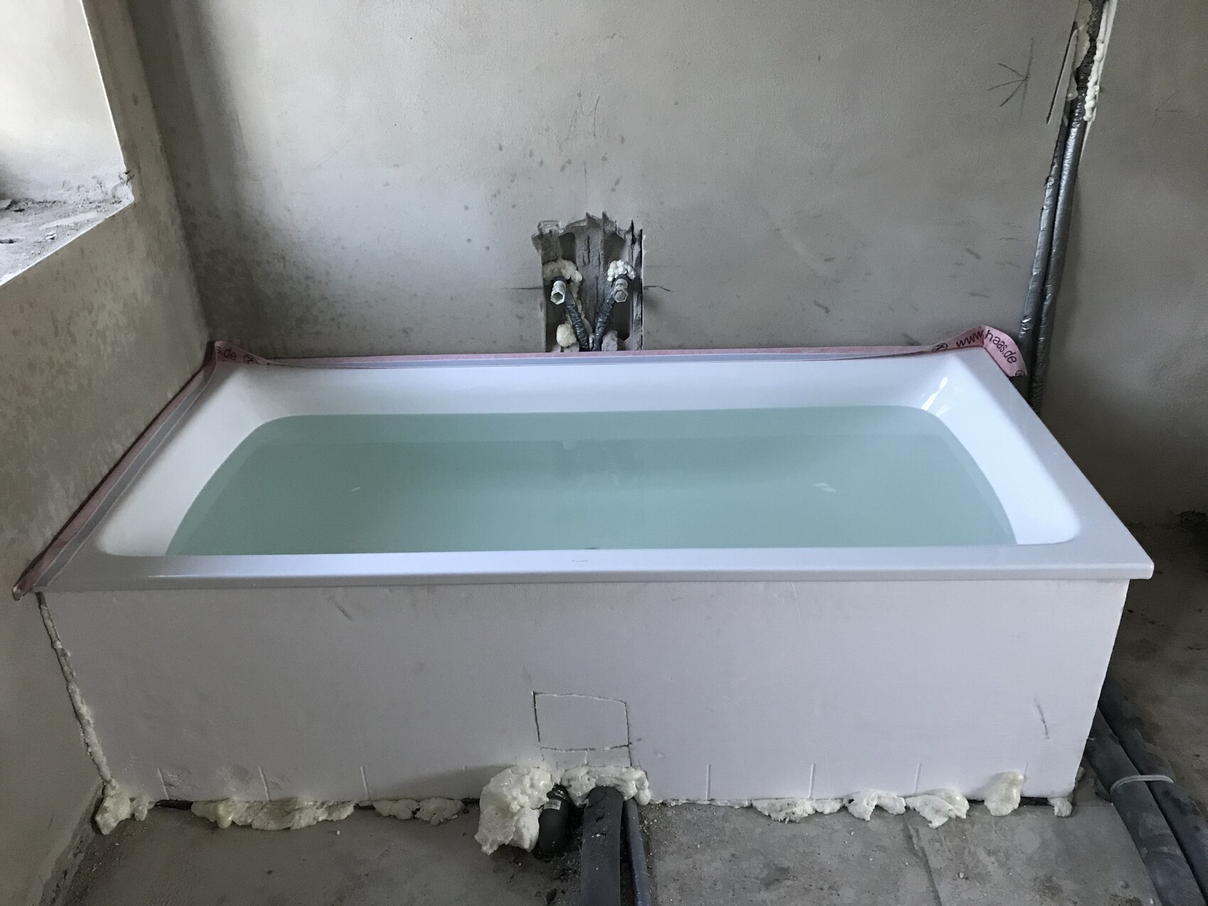 Helle Badewanne mit Wasser in unfertigem Badezimmer; sichtbare Rohre und Bauarbeiten.