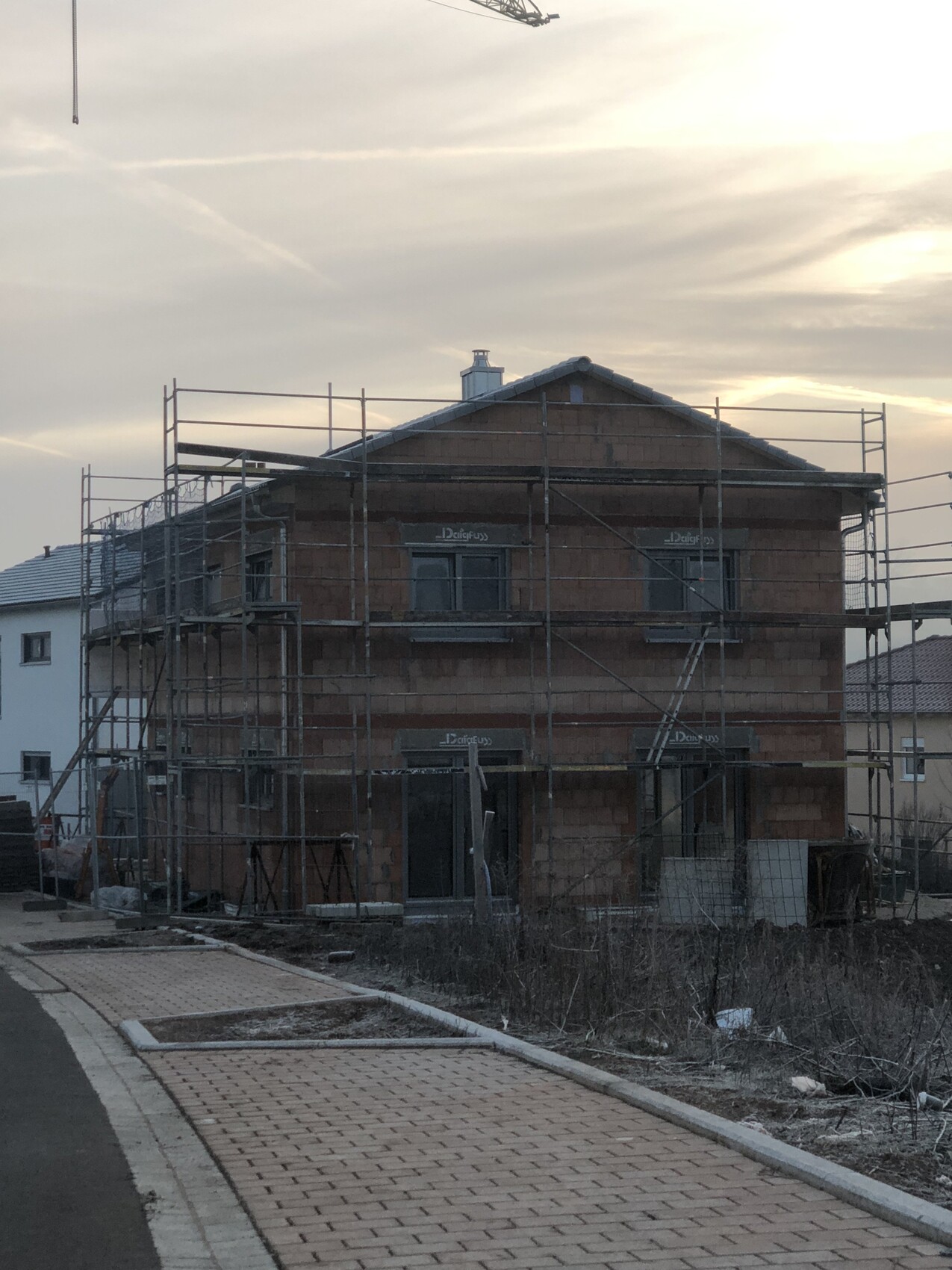 Das was Ihr hier seht sind 140qm Rohbau Wohnfläche zzgl. WU Ortbeton Keller in KfW55 Standard, mit Kaltdach, Fenstern, Innen-/Außenfensterbänken, Stahl/Holztreppe, Rohinstallation Sanitär, 3-Seitenkamin inkl. Schornstein, 36m 1,30er L-Steine, 240m³ Aushub/Deponie und Geländemodellierung.