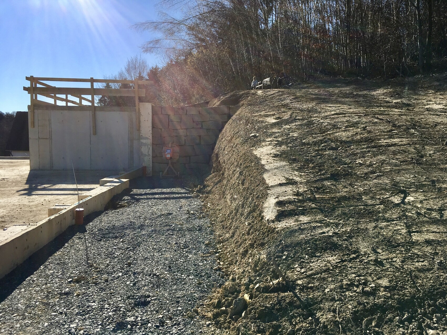 Nun sind wir auf der Ostseite des Hauses und können geradeaus zu den Hauseingängen gehen.(Die fast erwachsenen Jungs bekommen je eine eigene Haustüre und wir natürlich auch). Rechts führt die später bepflanzte "Rampe" hoch zum oberen Garten und auf das Obergeschossniveau.Oberhalb der Steinmauer ist eine kleine Terrasse vor unserem Schlafbereich.