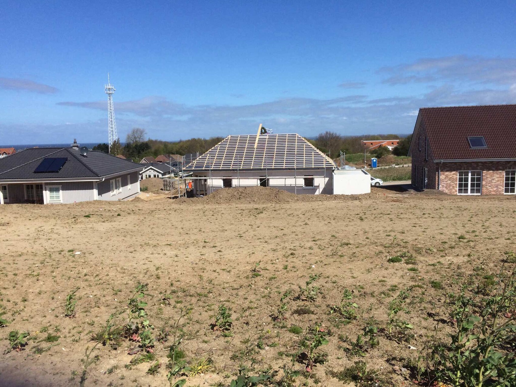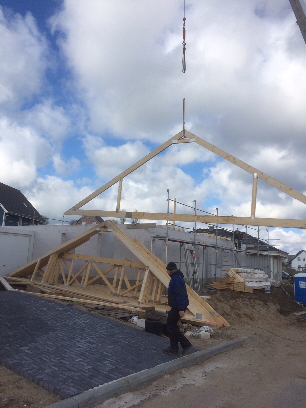 Die Woche nach Ostern war hier auch ne wilde Woche auf dem Bau. Es begann Dienstag mit Kran, Mittwoch war das Dach schon gut erkennbar, Do. kamen die Fenster, das Dach wuchs weiter. Freitag kamen Türen und Fensterbänke, dazu im Grossangriff drei Zimmerleute und ein Lehrling die Folie und Lattung aufs Dach. Heute machten sie die Unterschläge und irgendwas drinnen unterm Dach. Gleichzeitig lagert da nun eine riesige Menge Glaswolle vor der Garage und zwei Stapel Rigips in Folie. Die Pakete mit Holzbalken, Brttern und Latten sind hingegen fast alle. Karsten