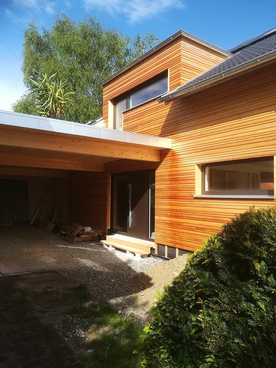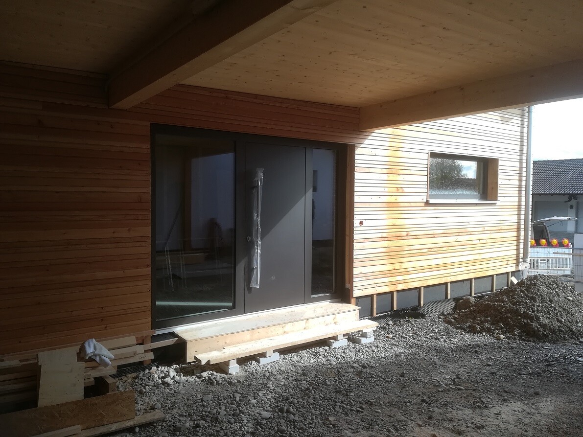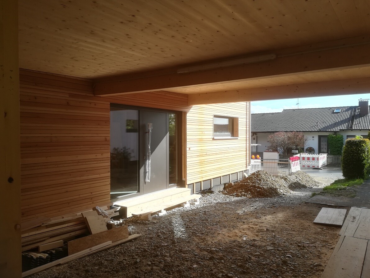 Die netten Handwerker haben uns auch gleich eine komfortiöse Eingangsstufe gezimmert - sehr schick, aber temporär, denn wenn im Carport gepflastert wird, dann wird keine Stufe mehr nötig sein.