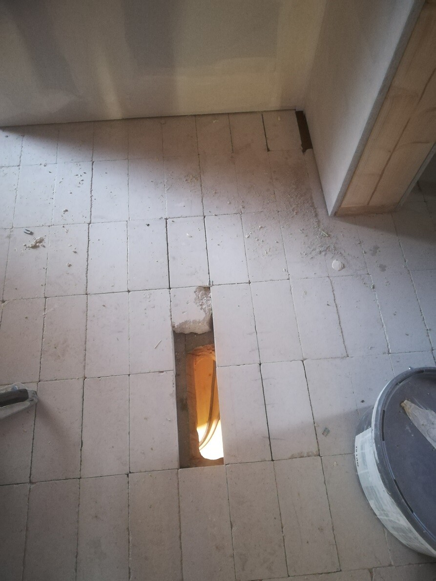 und durch dieses Loch im Boden (drunter ist der TK-Raum) kommen die Leitungen für die Fußbodenheizung:
