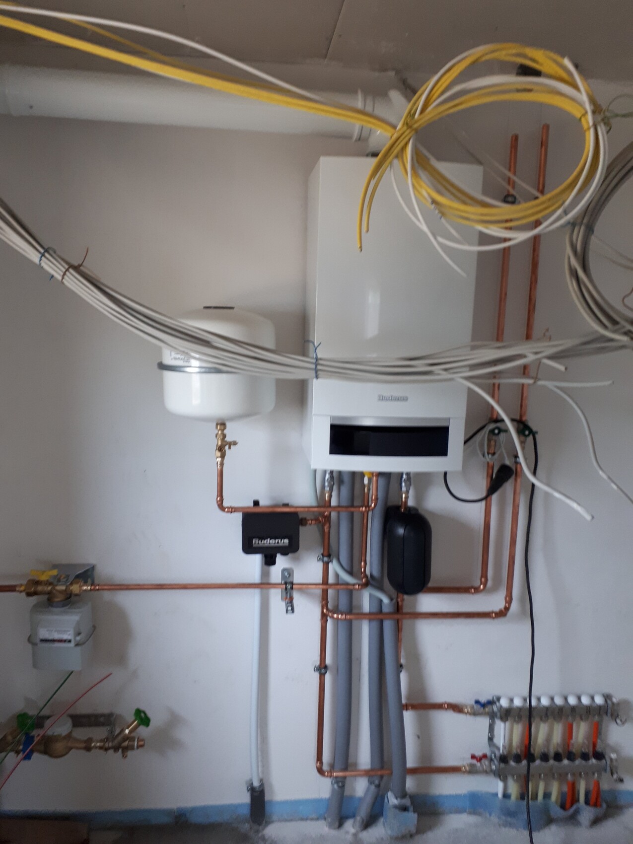 Bei uns wurde nun die Heizung in Betrieb genommen. Der Sanitär war am schwitzen, da die Tiefbauer der Versorger den Stromkasten zu mittig gesetzt haben und der Gaszähler nicht richtig passte. Mit hängen und würgen passte es dann aber doch. Rechte sieht man schon die Vorbereitung der Heizung für's OG, wenn den mal ausgebaut werden sollte. Sieht alles noch sehr wild aus, werden wohl auch den Schreiner bitten, dass zu verkleiden und auf der anderen Seite eine Arbeitsplatte über die Waschmaschine + Schränke zu werkeln. Haben unsere Nachbarn gemacht und das sieht so mega aufgeräumt im Hauswirtschaftsraum aus und bringt zusätzlich Stauraum.