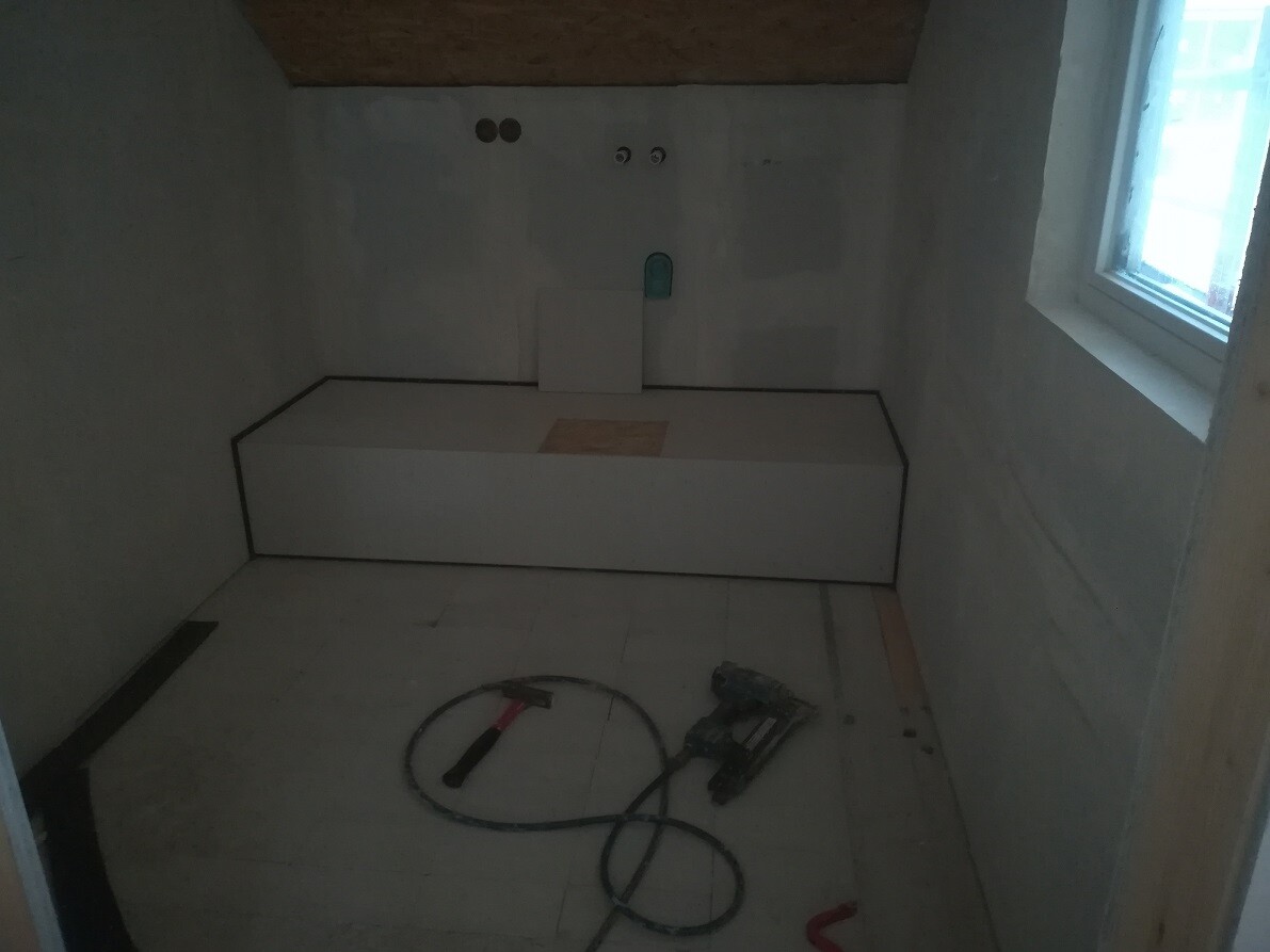Diese Woche sollen alle Arbeiten an den Wänden fertig werden und mit der Grundierung begonnen werden. Dann kann gemalert werden. Danach kommen die von uns bereits gestrichenen 3-Schicht-Bretter im DG an die Decke und dann wird die Fußbodenheizung verlegt und die Fliesen und das Parkett können verlegt werden. Geht also jetzt flott. Da wir keine Trockenzeit für einen Estrich beachten müssen, flutscht es jetzt durch.Muß ich berichtigen: Grundieren tun sie jetzt schon, dann Decke, dann Boden (Fußbodenheizung nächste Woche, Parkett dann die Woche darauf) und erst dann wird final gemalert... aber insgesamt wird das wohl alles noch vor Ende Juni fertig sein.
