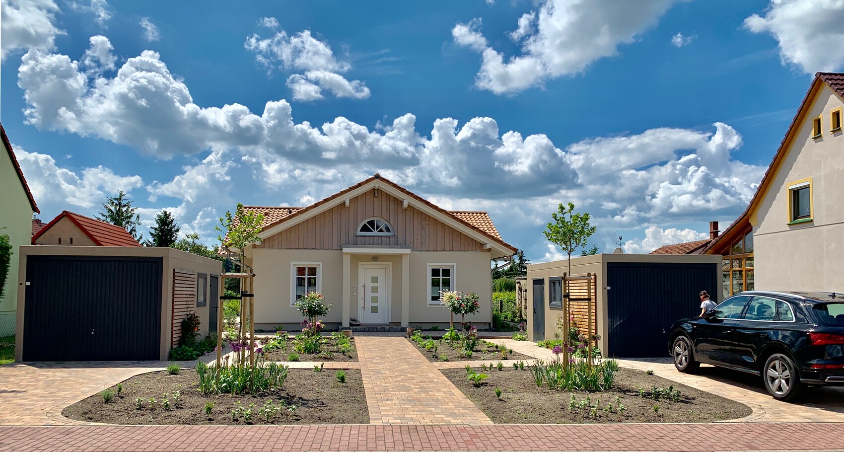 Heute war ein traumhaft schöner Tag und da ist dieses Foto entstanden... Wir wohnen jetzt genau 2 Jahre im neuen Zuhause. Irgendwann soll alles grün bewachsen sein, solange gedulden wir uns. Über den Sommer behelfen wir uns mit Studentenblumen in Unmengen.. Ich vermisse derzeit allerdings die preiswerten 10er Trays, die sonst überall zu dieser Zeit verkauft werden. Und meine eigenen Samen wollen nicht so recht keimen.. naja wird schon.. LG Steffi
