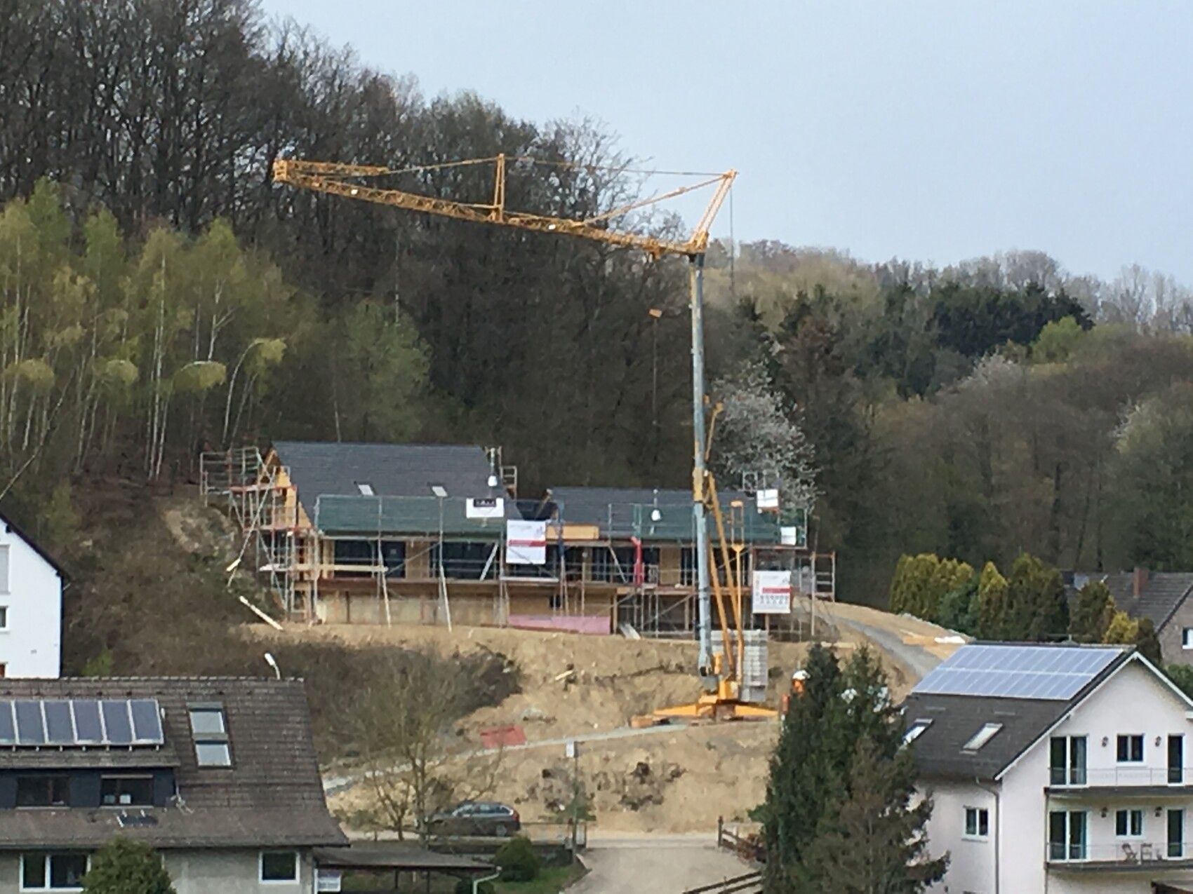 Baustelle mit gelbem Kran und Gerüst in Hanglage; Häuser mit Solarpanelen.