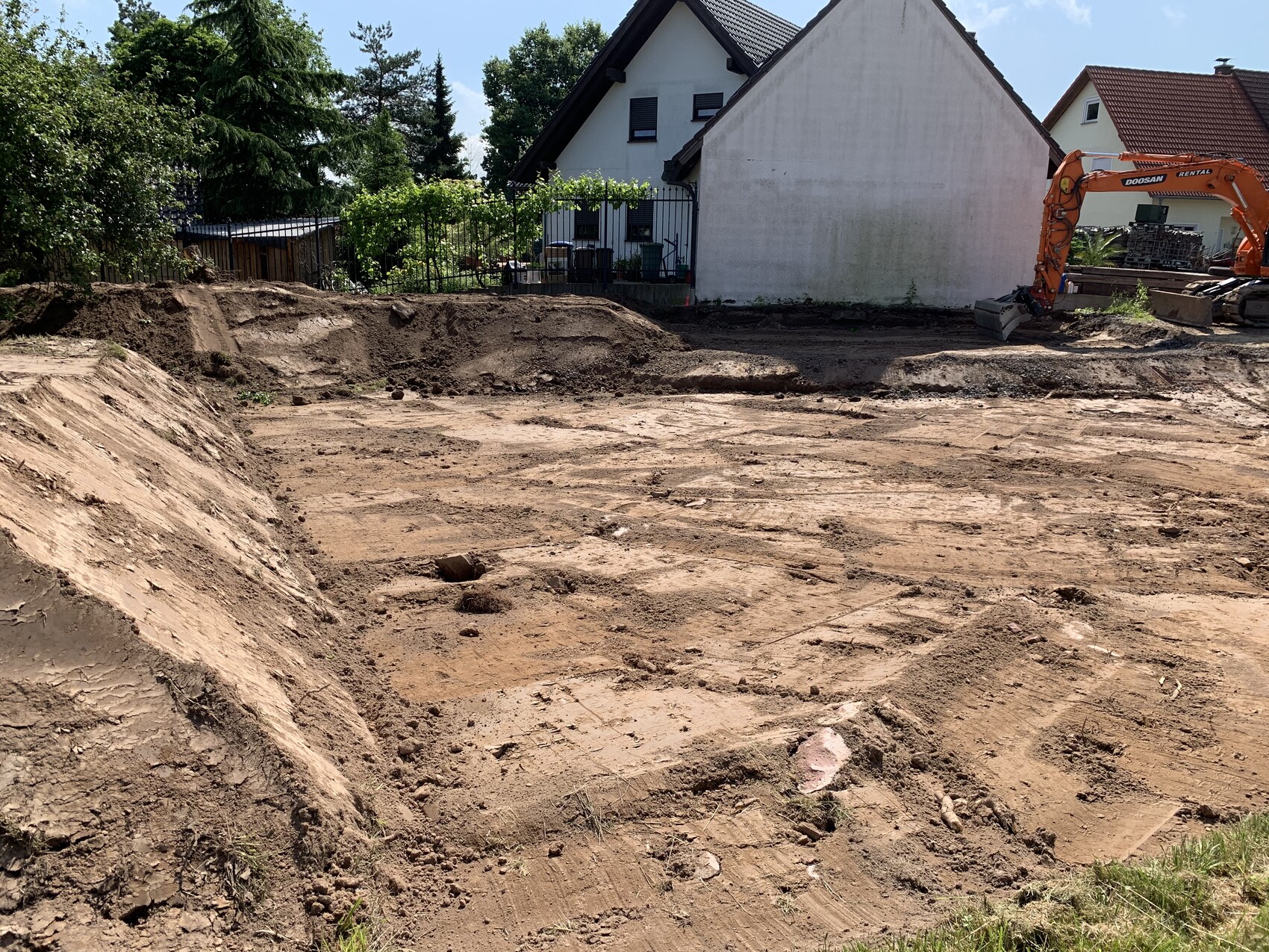 Baugrube mit ausgehobener Erde, orange Bagger rechts, Wohnhaus im Hintergrund