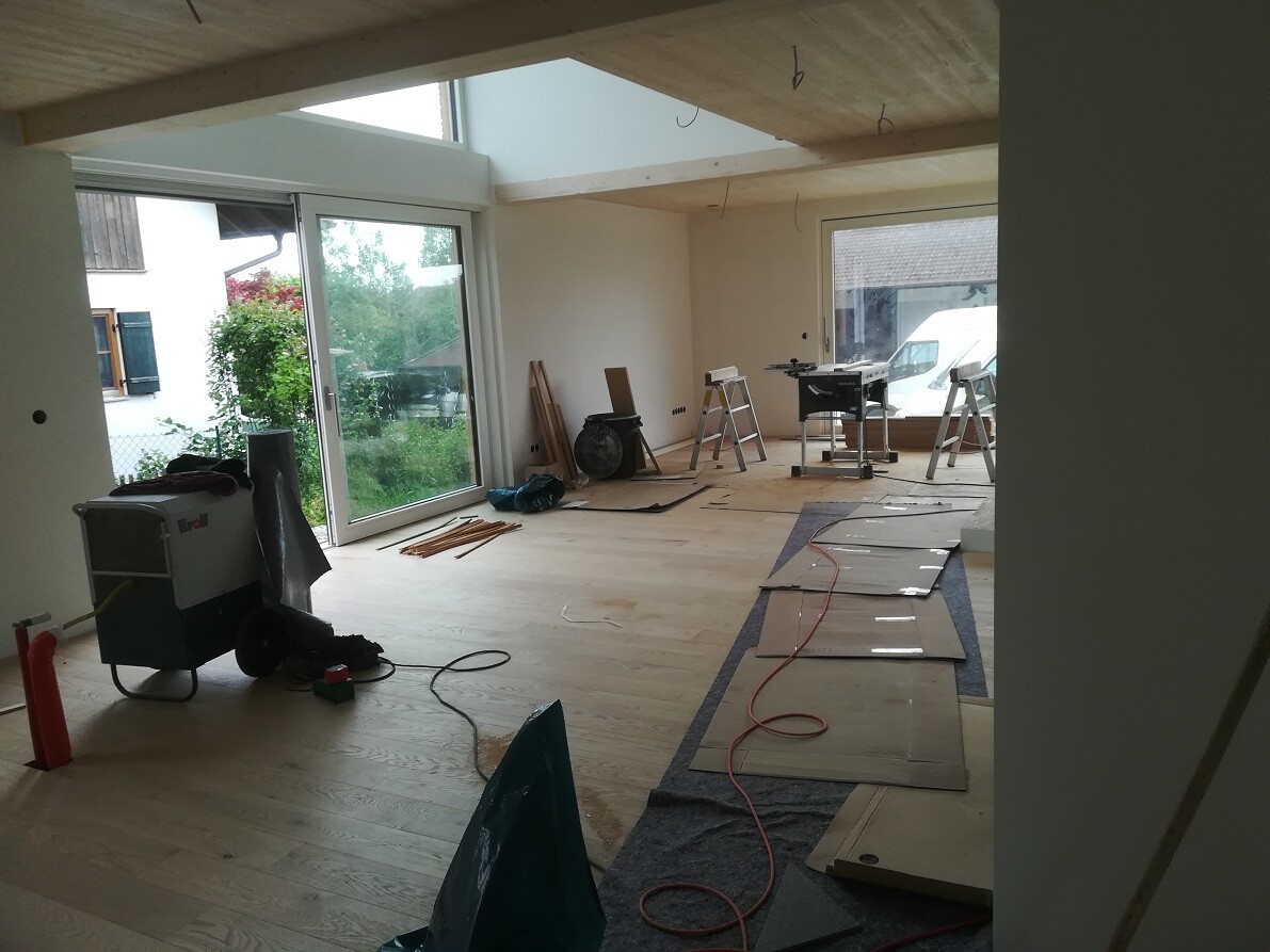 Fotos ohne Interimswerkstatt wird es noch eine Weile nicht geben, denn jetzt wird oben der Boden verlegt, aber zugeschnitten wird, aus Platzgründen, weiterhin unten - naja - auf das volle "Ach-wie-schön-ist-unser-Boden"-Gefühl werden wir also noch ein oder zwei Wochen warten müssen.