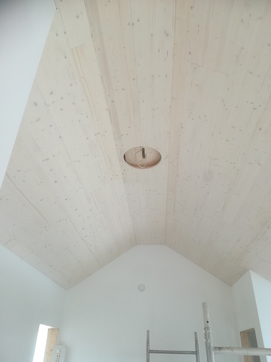 Bei der Decke hatte ich nicht viel Wahl: es ist ein Holzhaus, das was man an der Decke sieht ist schlicht die Zwischendecke zwischen EG und OG. Wir hätten da noch Fermacell drüber legen lassen können, aber da wir eh nur 2,50cm hohe Decke haben und das wieder einige cm gekostet hätte, haben wir das sein lassen. Außerdem fanden wir das Holz an und für sich schön. Der Kompromiss war eben, daß es jetzt mir weißer Lasur gestrichen wurde. So bleibt die Holzstruktur erhalten, aber ist nicht so präsent. So ist es für mich ok, ansonsten wäre es mir auch zu holzig, also Natur hätte die Decke nicht bleiben dürfen.
