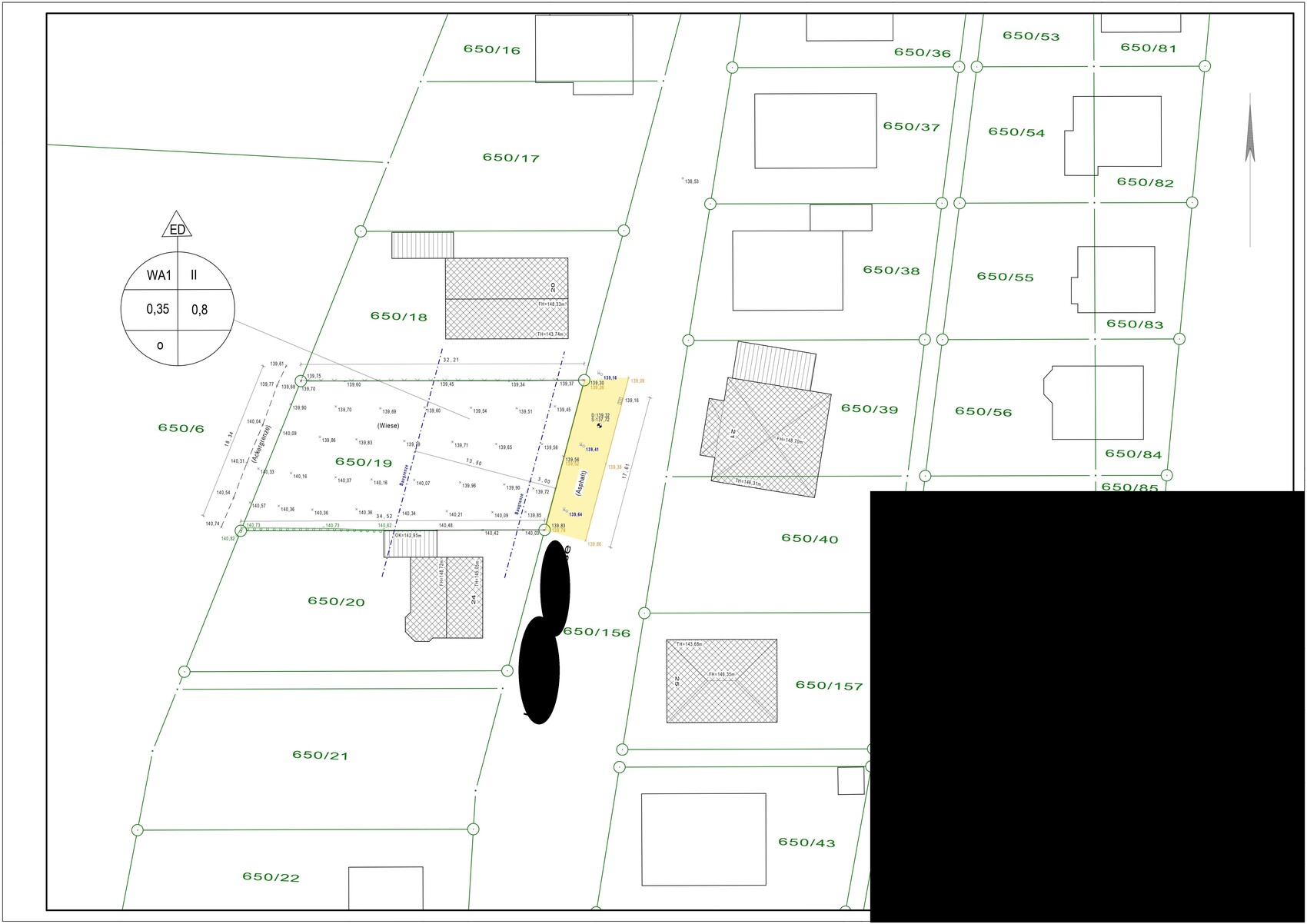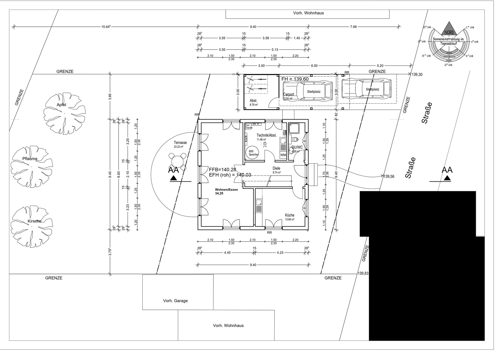 Warum der Carport partout 30cm höher als das vorhandene Nachbargrundstück, und das Haus - ohne Keller - 80cm höher als die Strasse schweben soll, hat bisher noch keiner verstanden. Sinnvollerweise würde man Strasse und nördliche Grenze als gegeben ansehen und daraus die Höhe Fertigfußboden bzw Carport ableiten.