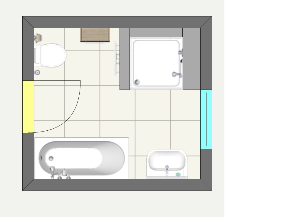 Badezimmer-Grundriss: Badewanne links unten, Toilette links oben, Dusche oben, Waschbecken rechts.
