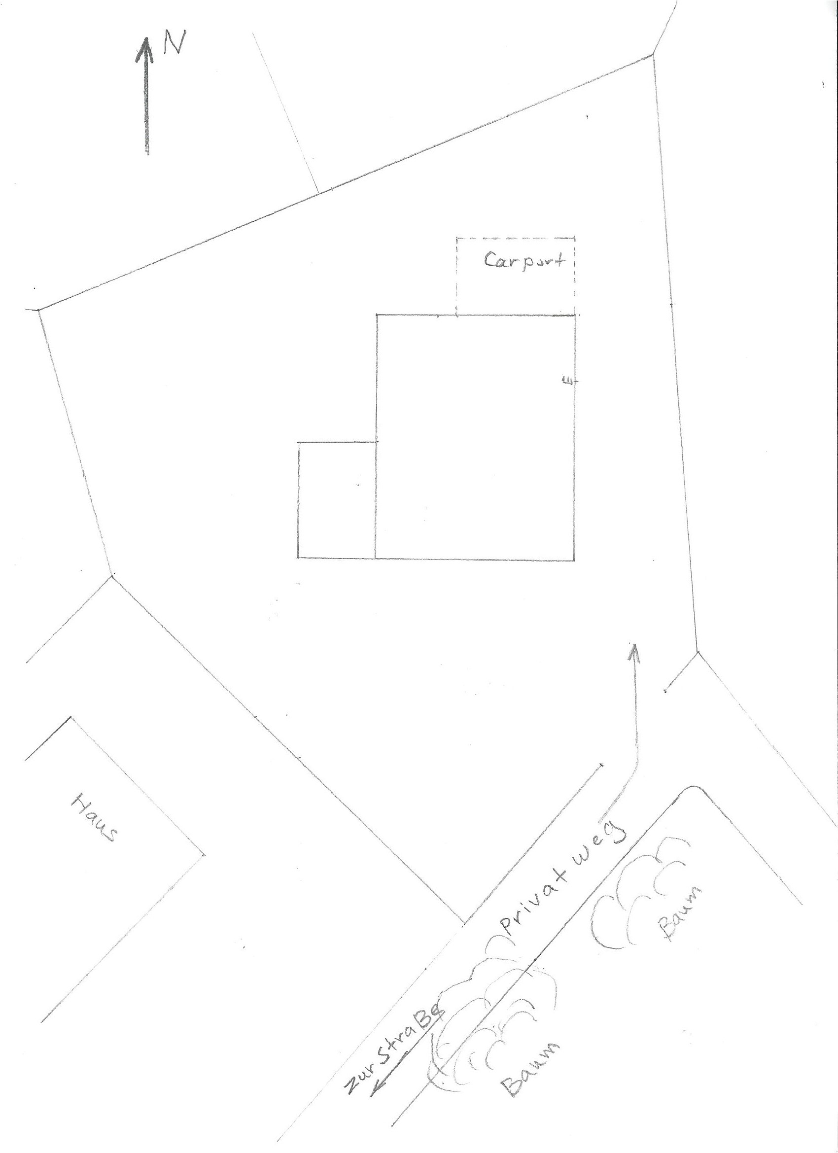 Wie haben Paar Änderungen gemacht, neue Bilder mit einem primitiven Lageplan sind anbei. Wir werden wohl keine Garage brauchen, aber sicherlich ein fertiges Gartenhaus für Fahrräder und Gartengeräte. Die Lage dafür ist noch nicht bekannt.