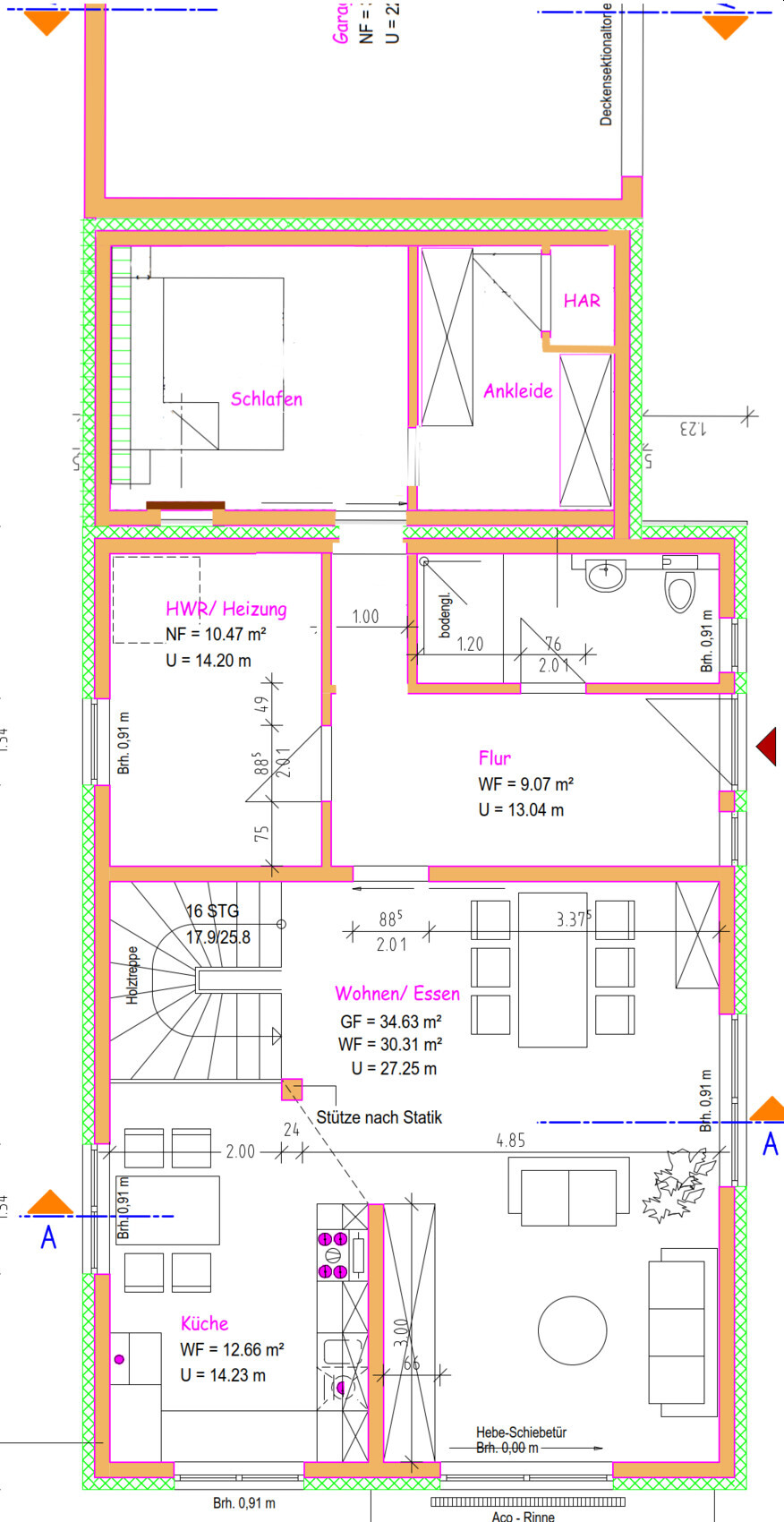 Diese Seite des Hauswirtschaftsraum (also auf dem Grundriss dann die Nordseite) ist komplett voll mit Leitungen. Wasser/Gas/Strom/Heizung....Ja, Leitungen umlegen ist aufwändig und teuer; die Details müsste man mit den Versorgern und Installateuren besprechen. Dein Plan ist aber IMHO deutlich aufwändiger und teurer.Basti2709 schrieb: