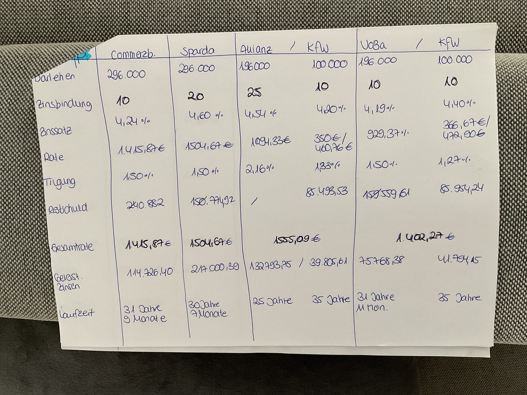 Im Verlauf dieses Threads wurde schon kommuniziert, dass man eher nicht die KFW mit reinnehmen solle.Du wirst zwei verschiedene Laufzeiten haben, einmal der lange Hauptkredit, dann der 10jährige Kfw.Nach 10 Jahren musst Du also die Restschuld vom KfW-Kredit neu finanzieren. Das kann ein Problem geben.