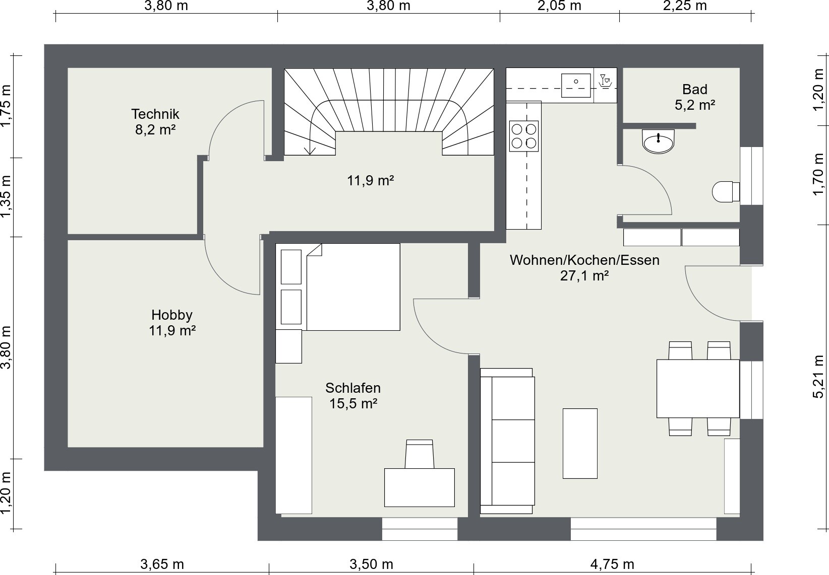 Könnte mir vorstellen, dass man das statische Problem zumindest schon mal minimiert, indem die nördliche Wand des großen Wohn/Koch/Essbereich als Tragende Wand ausführt, dann liegt die Nord/Süd Spannweite eigentlich immer bei ca. 5m.