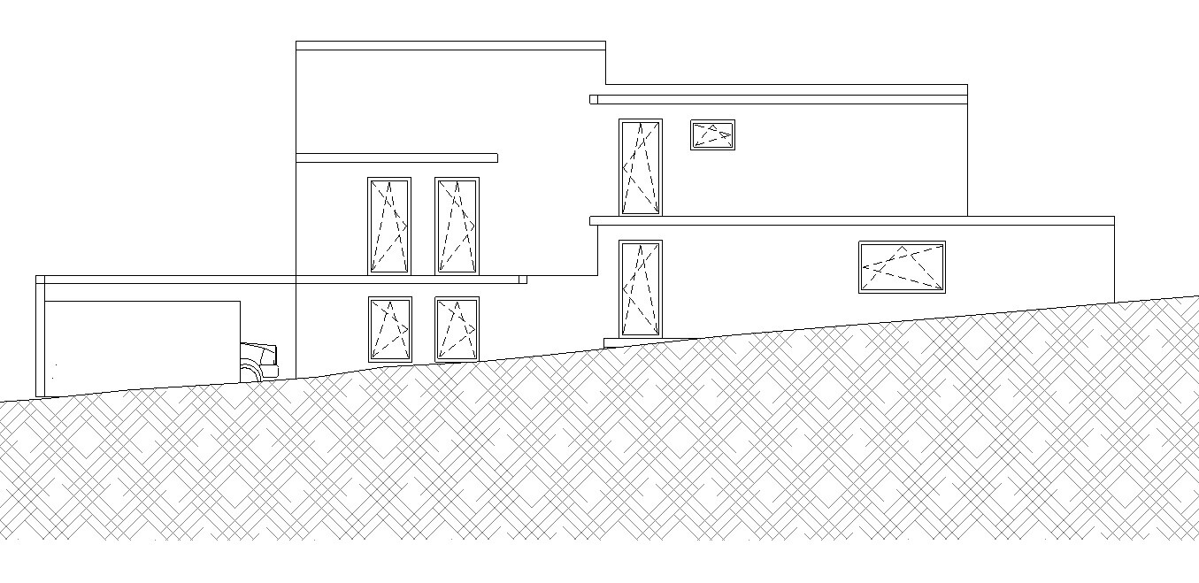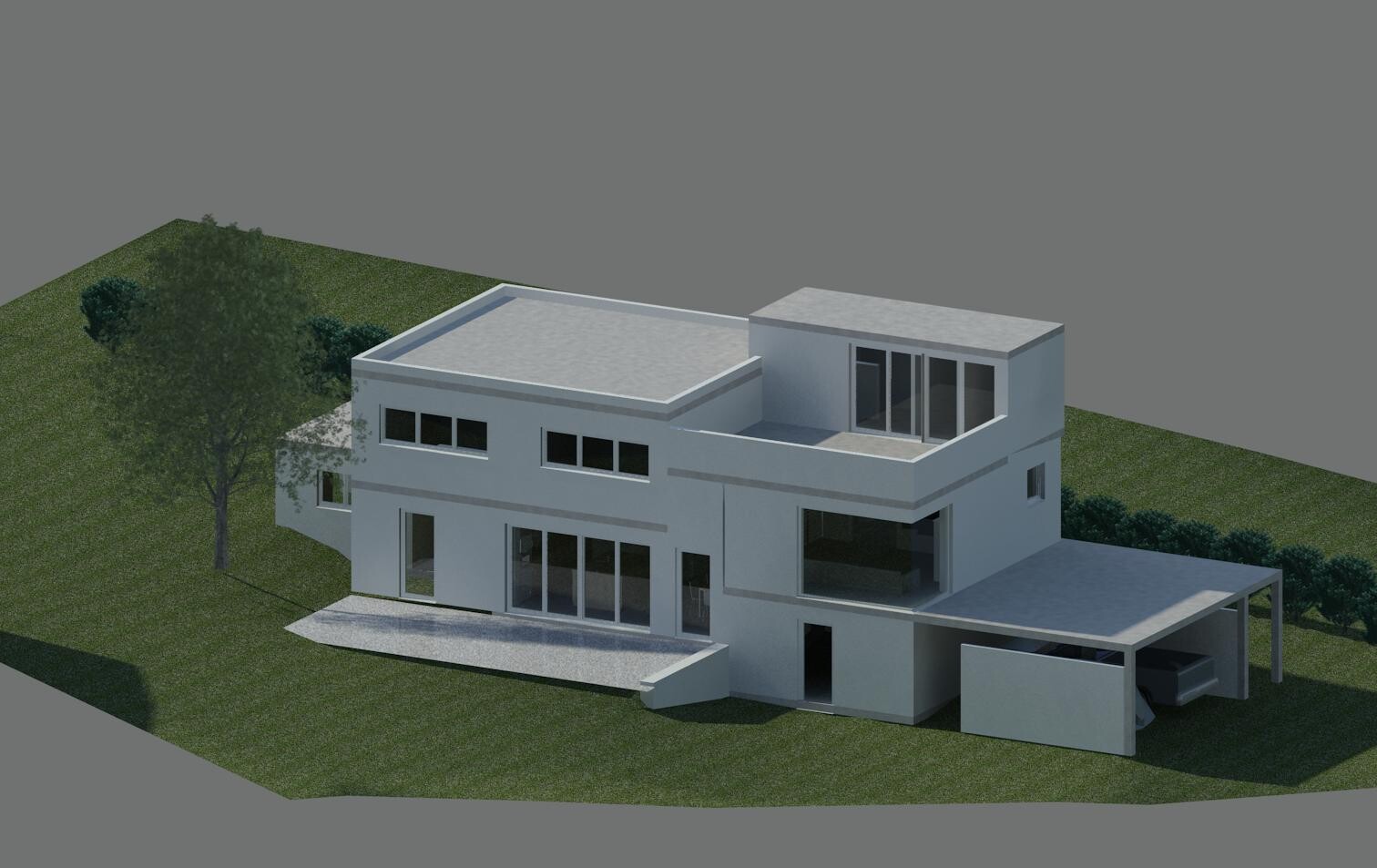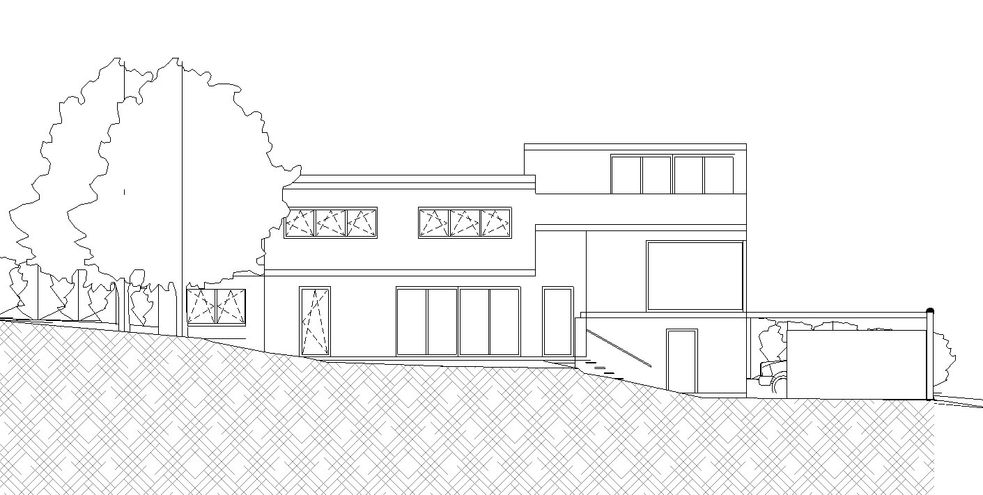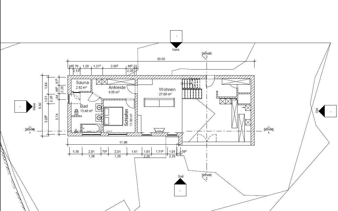 Eine andere Zugangsmöglichkeit ist mit dem Ausgang zur Nordterrasse zwar möglich, aber um den Vorteil auch wirklich nutzen zu können, müsste man nördlich des Hauses eine Art Rampe bauen, um auch mit dem Auto hoch fahren zu können. Das führt zu enormen Kosten und außerdem hätten wir dann eine Einfahrt mit 15% Gefälle, welche wir jedes mal rückwärts runter oder hoch fahren müssten.