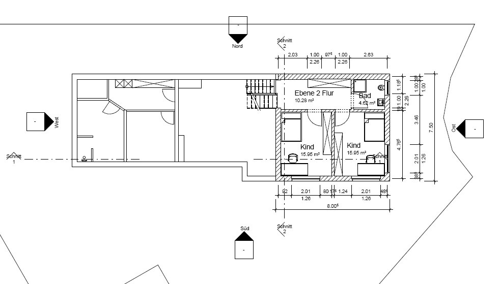Wir sind da noch am überlegen, ob es Vorlauf sinnvoll wäre, die Südwand der Kinderzimmer ein kleines Stück nach Süden zu verlegen, damit die Zimmer ein bisschen größer werden.