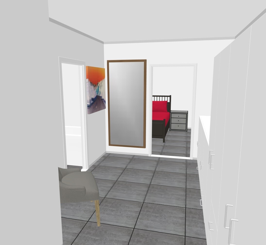 Die Situation in der Ankleide sieht 4m Schrankwand vor, daneben planlinks unter dem Fenster ist noch Platz für 2m Kommode. In dem Breiteren Bereich nördlich des Bades ist dann auch noch Platz für einen Spiegel und einen Stuhl. Wie von @kbt09 richtig angemerkt, wäre dann planunten hinter der Türe auch noch Platz für Schränke, die nicht so tief sind. Im Anhang ein Bild, wie wir uns das vorstellen.