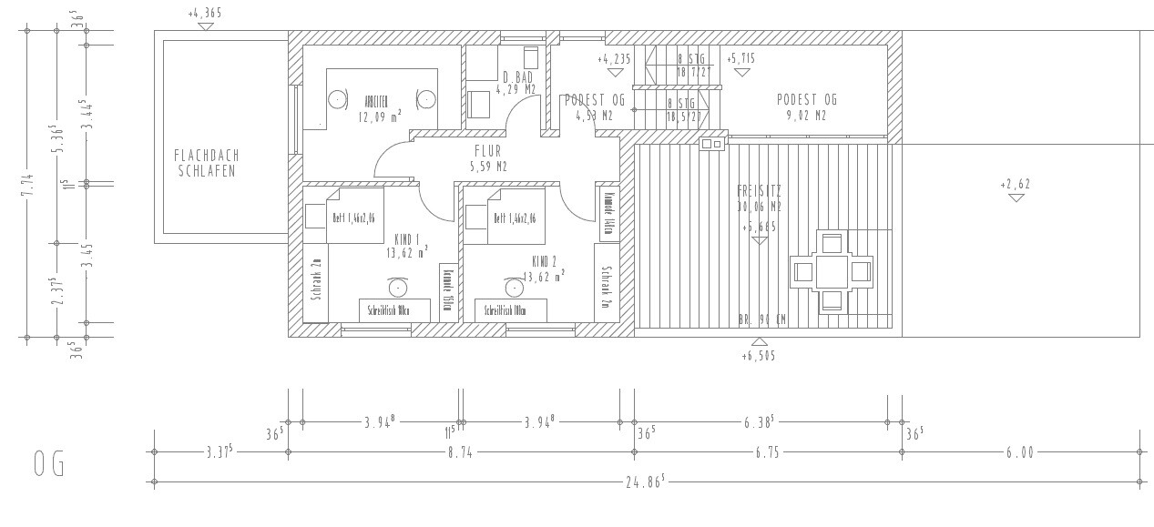 Die Aufteilung vom OG bleibt gleich, Arbeitszimmer und Kinderzimmer werden also gleich groß, wie in dem letzten Entwurf. Hab den aktuellen Stand leider nicht zur Verfügung.