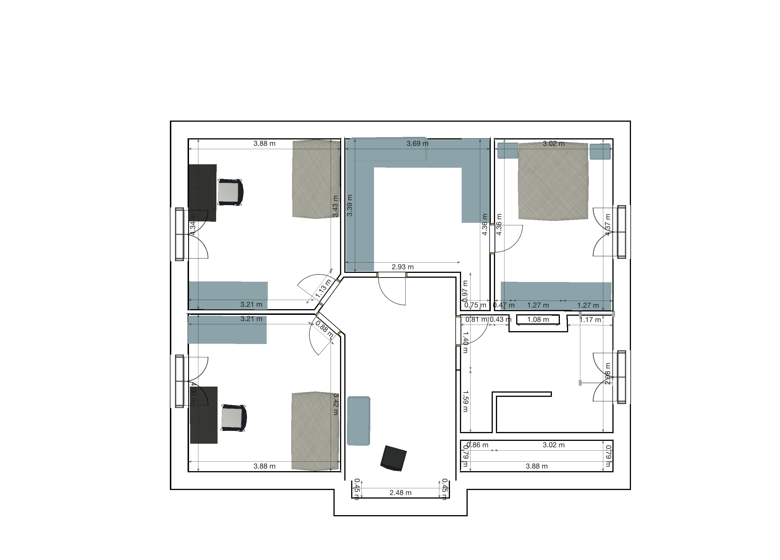 Zeichne mal Möbel in Originalgröße ein. Wird der Raum Oben rechts das Schlafzimmer? Wenn ja die Möblierung möchte ich sehen.