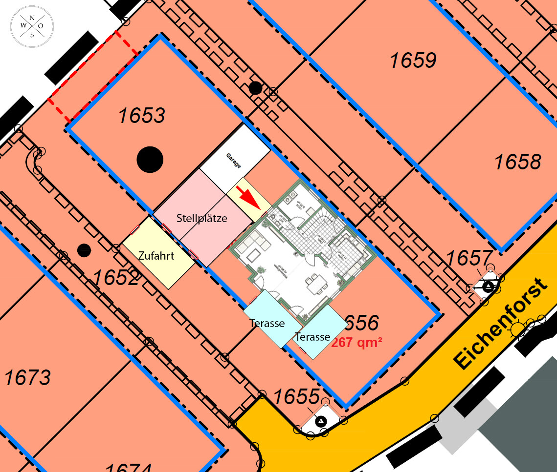 PS: Anbei noch ein größerer Plan vom Grundstücksverkäufer der auch die Erschließung in Auftrag geben wird. Er hat in seiner Zeichung die Häuser auch in die Ecke platziert wie wir und den Hauseingang auch auf der Seite des Fußweges. Nur auf unseren Grundstücken waren zunächst zwei Häuser geplant.Was spricht denn gegen die dort vorgeschlagene Anordnung? Sieht doch sinnvoll aus und eröffnet euch einen Garten in wunderbarer Süd-Ausrichtung (planunten, meinethalben auch Süd-West).Wenn ihr das Haus so anordnet, könnt ihr in 25 Jahren das Grundstück teilen und ein Kind kann ein zweites Haus bauen. Es wäre zumindest eine Möglichkeit. Wer weiß schon, was dann ist ...