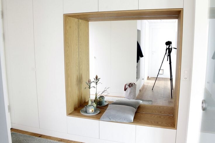 Weiße Wandnische mit Holzrahmen, Sitzbank und Kissen, Vasen und Kamera auf Stativ im Hintergrund.