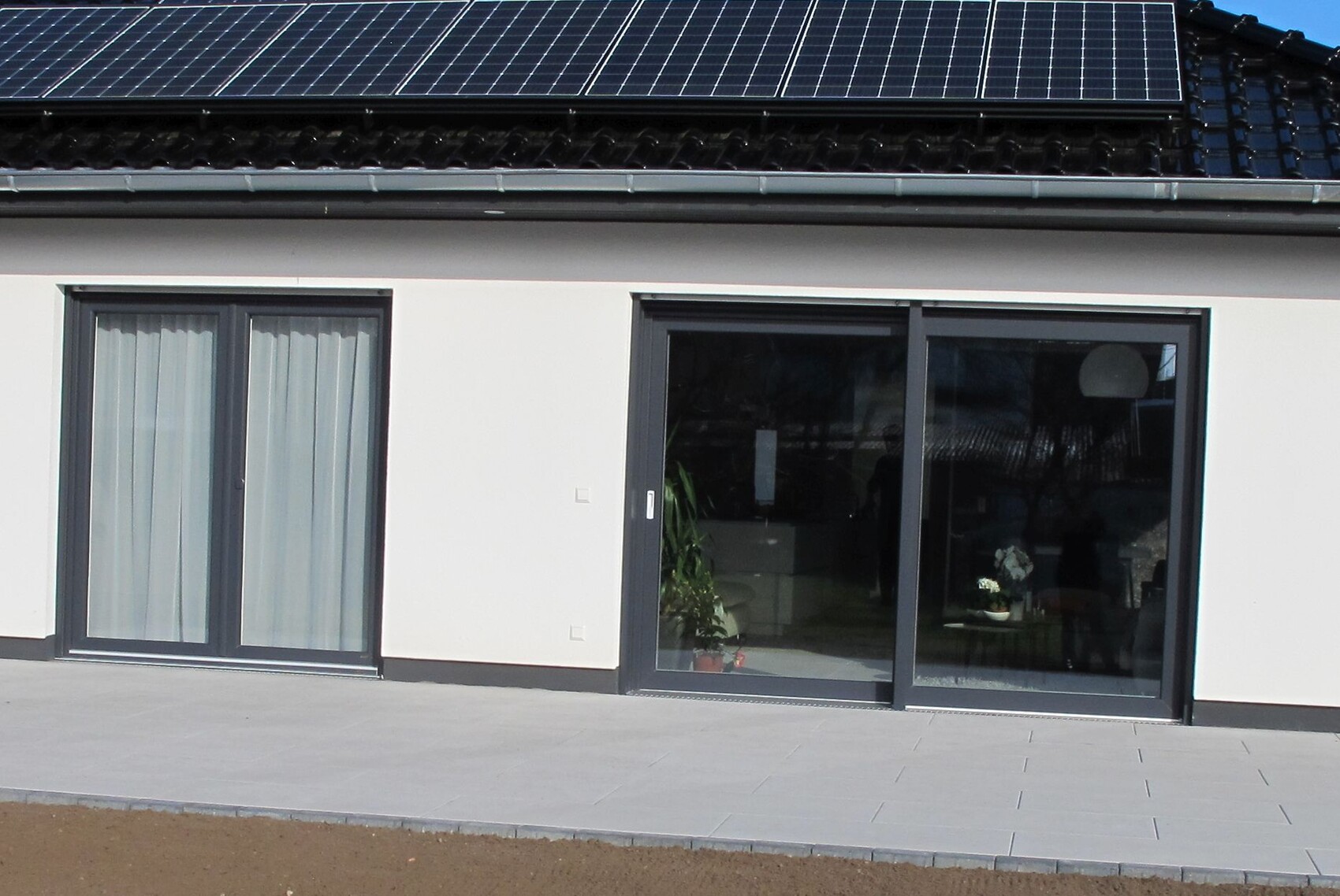 Moderne Hausfassade mit Solarpanelen auf dem Dach und großen Glas-Schiebetüren zur Terrasse.