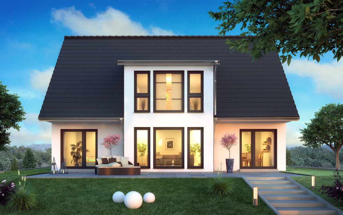 Modernes weißes Einfamilienhaus mit dunklem Satteldach, großen Fensterfronten, Terrasse und Garten.