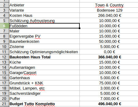 Final sind wir bei einem anderen Anbieter gelandet und machen gerade noch das Gesamtbudget fix. Aber wo du nach final fragst...in der Zwischenzeit haben wir den Keller weggelassen weil zu teuer und hatten dann bei Town & Country das Bodensee 129 als Überlegung. Ich hänge mal einen Ausschnitt aus meiner Vergleichstabelle an. Ist an manchen Stellen sicherlich überschätzt und an anderen unterschätzt (und in der Endkalkulation ist das bei mir auch an einigen Stellen berücksichtigt) aber du merkst sofort, da sind wir beim Gesamtbudget deutlich weiter weg. Der Preis von 270 000€ passt hinten und vorne nicht