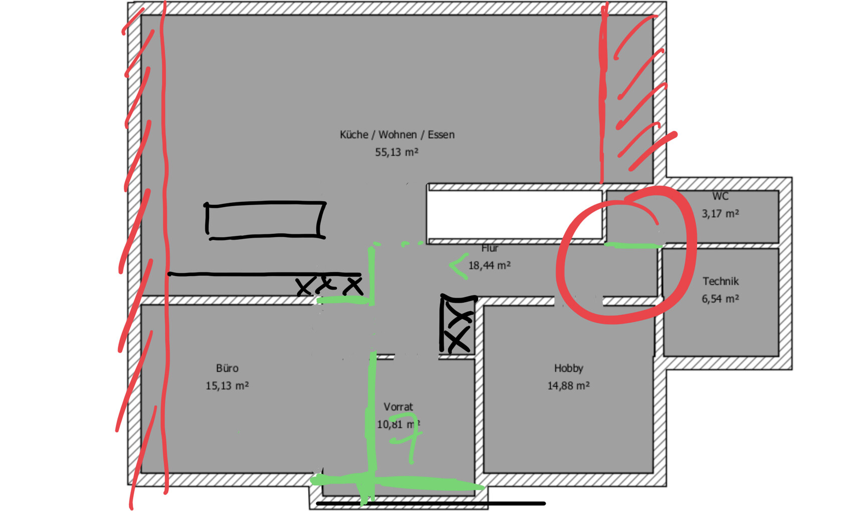 Insgesamt sind das vermutlich immer noch zu viele Quadratmeter. Vielleicht kann man das gesamtkonstrukt hier noch ein paar cm an allen Außenseiten kleiner schieben, damit es von der Gesamt - QM - Zahl etwas kleiner wird.