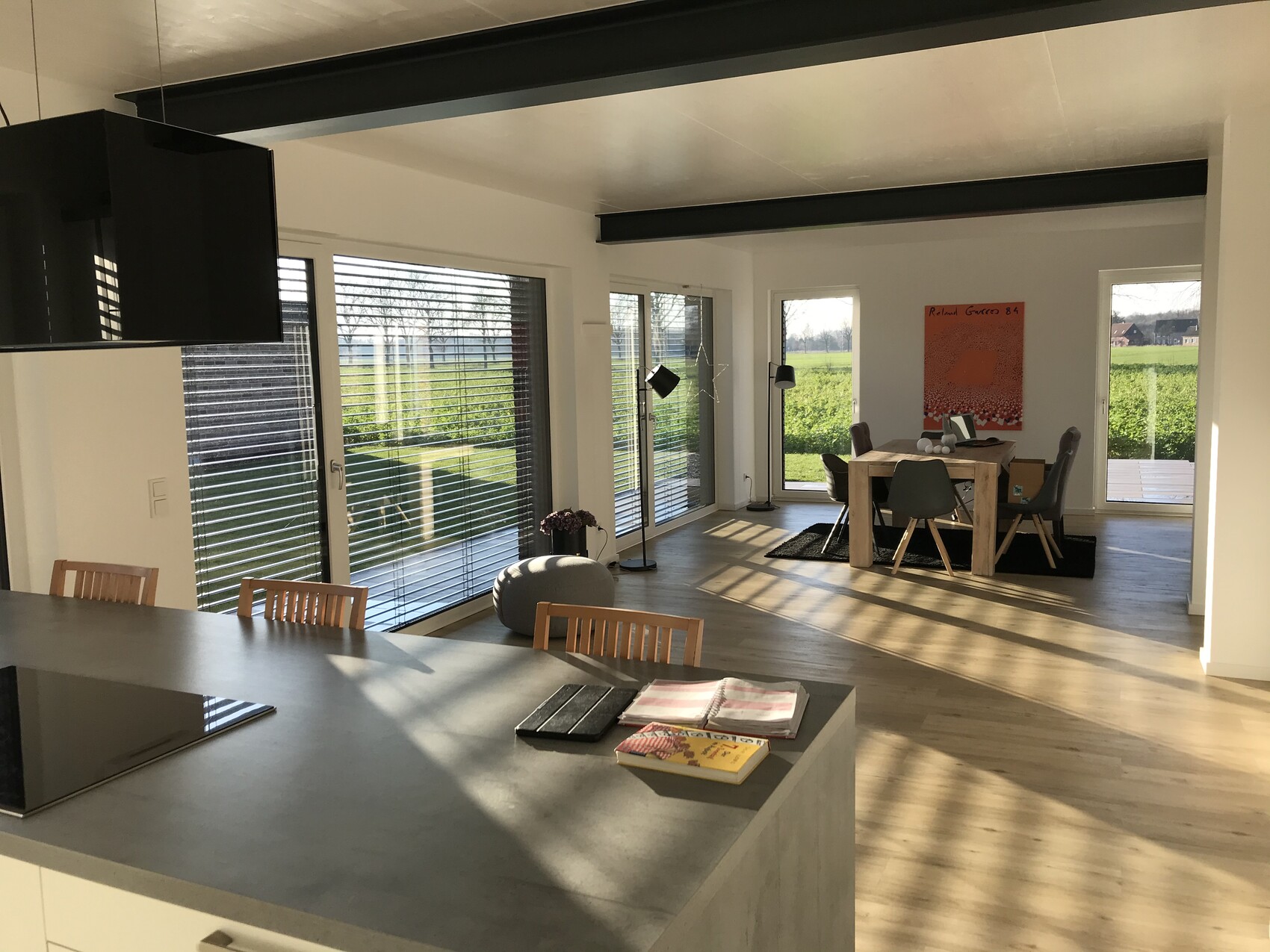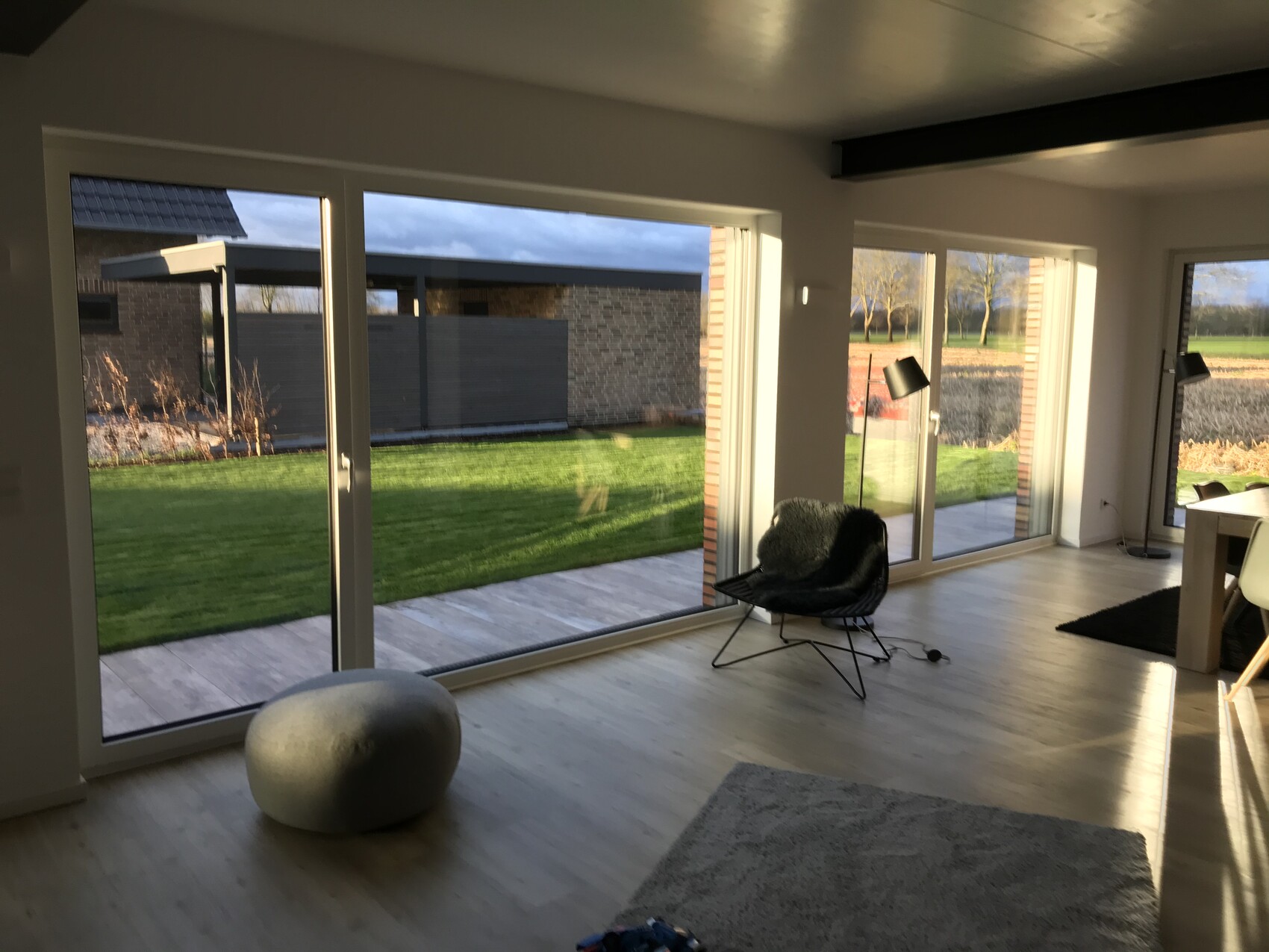 Wir haben jetzt 205qm auf 544qm Grundstück direkt am Feld. Es ist schön geworden und wir sind Ende 2018 eingezogen- zu viert .