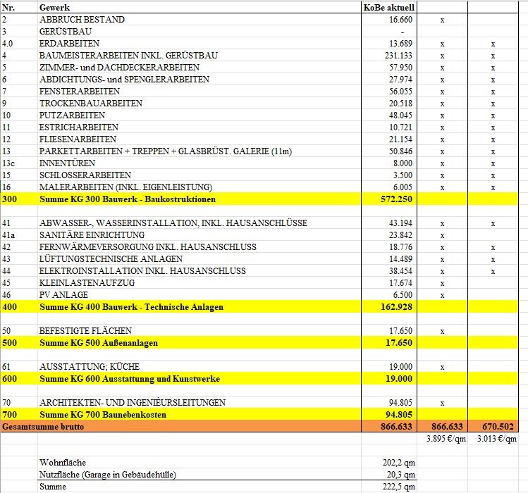 Also ich habe mal falls es jemanden Interessier unsere Hausbaukosten (867T€) angehängt. Haben letztes Jahr gebaut. Ich finde es zu teuer. Manches viel zu teuer manches nur teuer. Aber wir haben unterm Strich recht viel qm gebaut. Das war dem Grundstück geschuldet. Könnte man auf der grünen Wiese bestimmt kleiner und effizienter bauen, aber dann kommen evtl. mehr Außenanlagen dazu. Das ist bei uns wenig, da wir quasi auf einem "öffentlichen Platz" gebaut haben. Finde auch unsere Ingenieurskosten zu hoch (Architekt, Statiker etc.). Dachstuhl war auch teuer. Architekt sagte mir immer, dass viel unvorhergesehenes dazu kam, um an das bestehende Haus anbauen zu können. Allerdings kamen auch ca. 10T€ für die Unterfangung des Nachbargebäudes dazu.