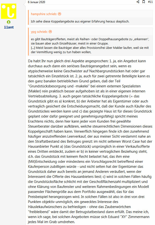 Kann man also davon aus gehen das es sich bei solchen Angeboten meistens um minderwertige Grundstücke handeln und es daher meist nur ein Marketing Trick ist? In der Tat muss ich sagen das mich Massa Haus insbesondere angesprochen hat da hier schon ein Grundstück dabei ist und der Preis relativ günstig wirkt."Wirkt", Du sagst es. Können Hans Sachs und ich davon ausgehen, daß Du meinen Links nicht gefolgt bist ? - da sind die Bauernfängertricks ausführlich erklärt.ypg schrieb: