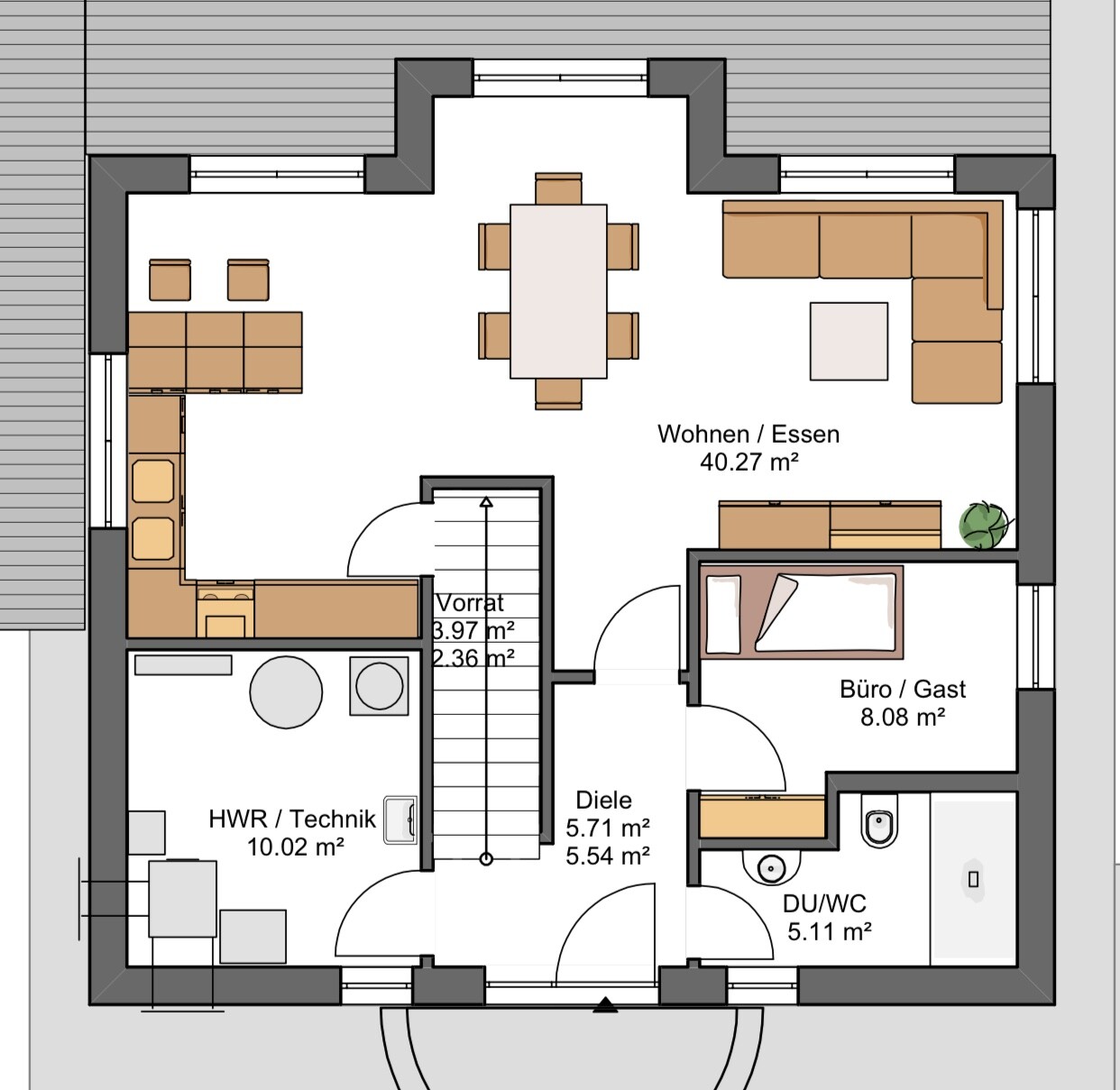 Es sind die gängigen Fehler: Erker keinen Nurzen in der Größe, schafft nur Kosten, Chillbereich als Durchgangsraum, genauso das Schlafzimmer (das will doch eigentlich keiner.