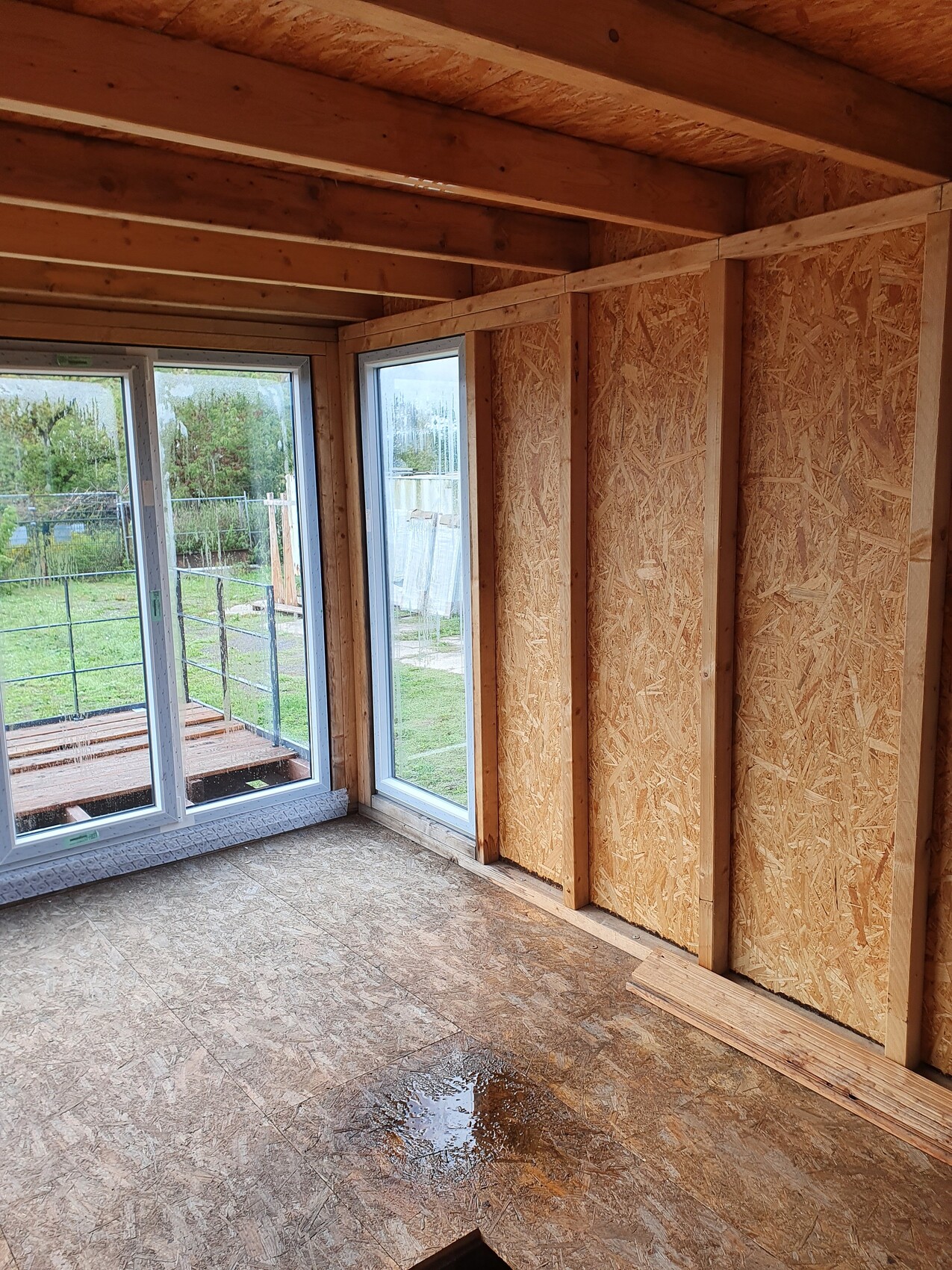 Das ganze Haus ist in Holzrahmenbauweise gebaut und der Fußboden besteht momentan nur aus OSB-Platten.