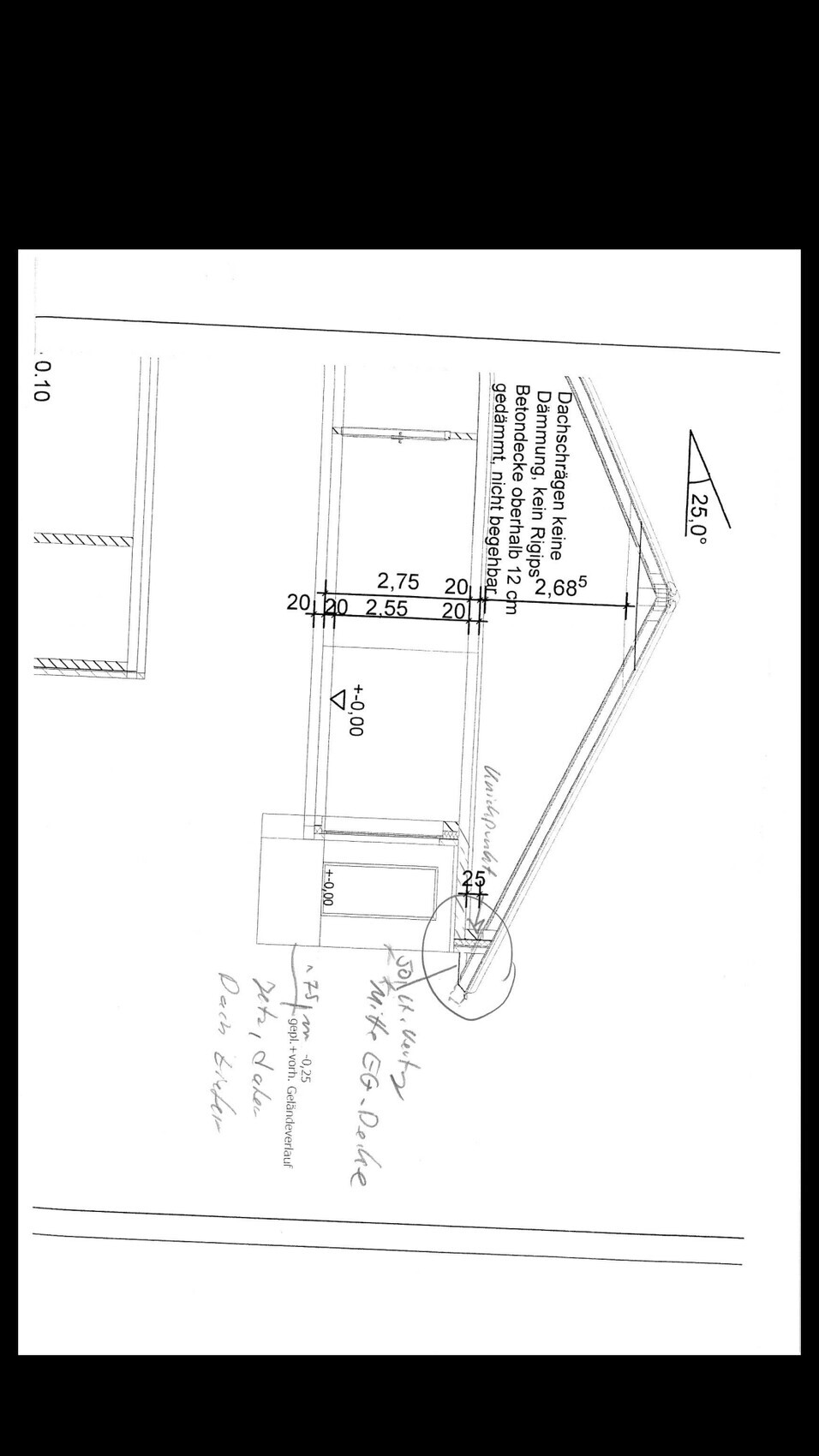 Es gibt Neuigkeiten... lt. GU war kein Kniestock vorgesehen, sondern die Markierung 25cm soll den Knickpunkt darstellen. Stimmt das oder möchte er uns veräppeln? Das Höhenproblem kommt jetzt seiner Meinung nach durch mehr Dachüberstand, die er uns geschenkt hat. Lt. Plan 50cm, aktuell sind es 75cm. Das hätte er von sich aus gemacht, weil es schöner aussieht beim Bungalow.