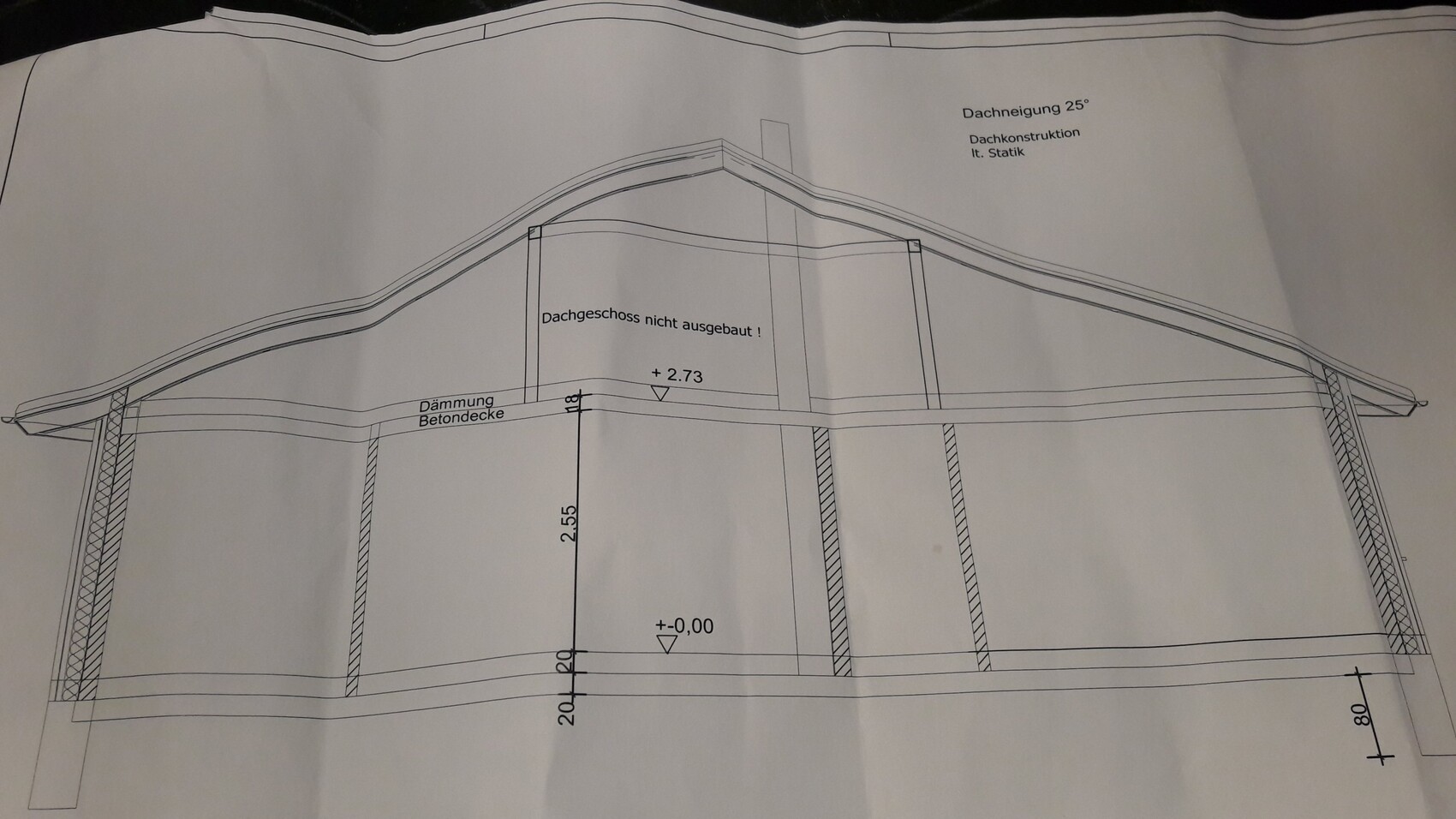 Nen echten Kniestock sehe ich auch nicht wirklich auf der Zeichnung für die Baugenehmigung. Vor allem weil die eingezeichneten 25 dort auch noch ja auf der Roh-betondecke anfangen (sprich die 12cm) gehen davon ab (die Dämmung ist da nicht Maßstabsgetreu eingezeichnet). Deshalb sieht das dort nach mehr "knie" aus.