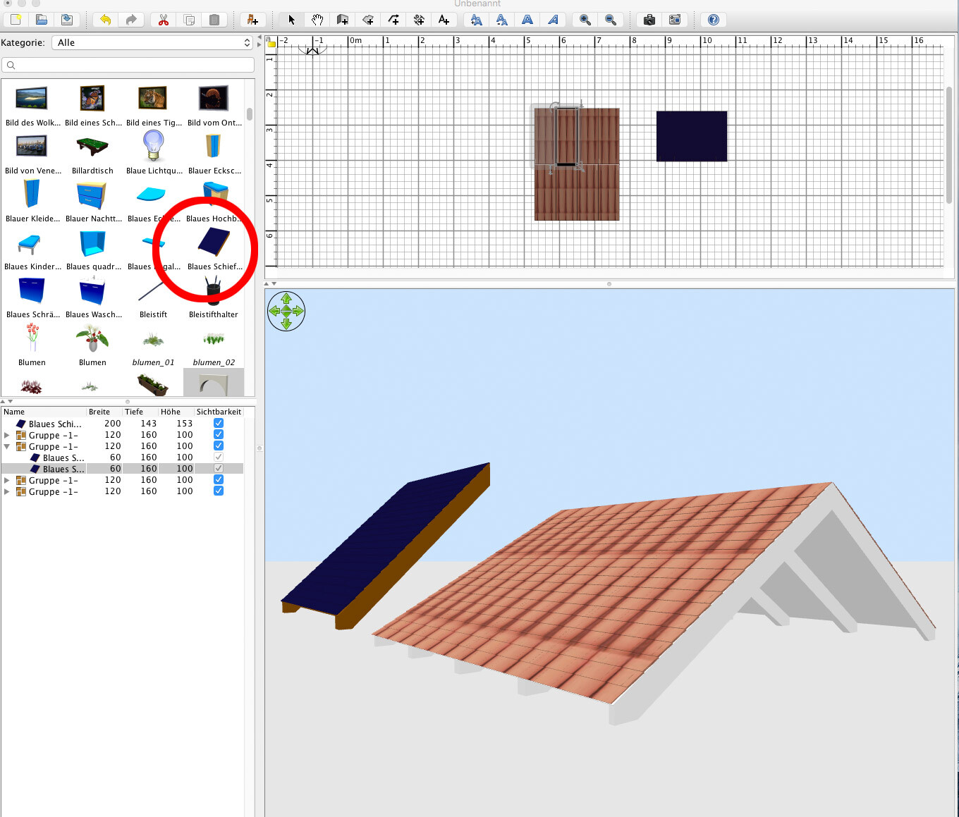 Gar nicht so schwer... aus dem Möbel "Blaues Schieferdach" lässt sich ein schönes Dach erstellen. Ich habe dazu den Flächen neue Texturen gegeben, ein bisschen an den Maßen geändert... und durch Duplizieren/Gruppieren der Einzelelemente ein schönes Satteldach geschaffen... Ein Kreuzdach zu erstellen ist schon komplizierter.. das muss man sich selbst bauen.. Anleitungen findet man in entsprechenden Foren. LG Steffi.